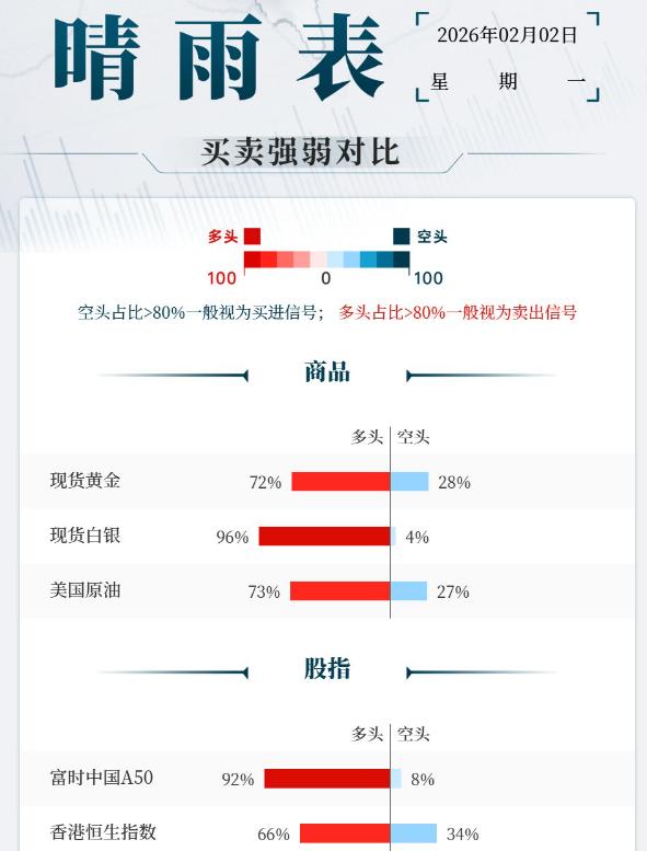周五晚上特朗普提名 美联储主席后贵金属遭遇血洗! 黄金盘中一度暴跌12%, 白银创下史上最大日跌幅; 周末美国政府进入“部分停摆”…… 后市金融市场的情绪如何? 通过下图,可以明显看出: 黄金的多头比例为72%, 空头比例为28%。 白银的多头比例高达96%, 超过80%的分界线, 空头比例仅为4%。