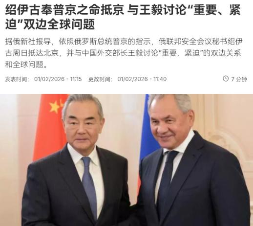 中俄双方谈妥了!普京总统亲自下令,绍伊古奉普京之命抵京,俄方定调与中国外交部长王毅讨论重要、紧迫的双边关系和全球问题。在绍伊古与王毅外长会晤后,绍伊古可以带着好结果,回去复命了。中俄达成多个共识。   绍伊古这趟北京之行,明眼人都能看出来,绝对不是走个过场、凑个热闹,2026年2月1日他搭乘专机抵京,身上扛的是普京亲自交代的硬任务,说白了就是来和咱们实打实谈合作、定调子,谈完立马就能回去复命,这份效率,也能看出中俄这次谈得有多顺。   毕竟距离两人上一次在莫斯科磋商,才过去两个月,短短时间内高层再度碰面,足以说明当下的国际局势,容不得半点拖沓,中俄都得拿出实打实的动作。   今年刚好是《俄中睦邻友好合作条约》签署25周年,这本身就是中俄关系的一个重要节点,也为这次会晤定下了友好协作的基调。   现在的世界乱得不行,二战后建立的国际秩序被搅得一团糟,有些国家总想搞“丛林法则”,仗着自己有点实力就横行霸道,中俄作为联合国安理会常任理事国,又互为最大邻国,要是不抱成团,不光自身利益可能受影响,全球的和平稳定也少了个重要支撑。   所以这次会晤,核心就是把两国元首之前达成的共识落到实处,把双边协作再往深里推、往实里走。   王毅外长和绍伊古聊得很透彻,从双边关系到全球热点,没有半点藏着掖着。俄方这边态度很明确,一如既往坚持一个中国原则,盯着那些想破坏台海稳定的势力,也坚决反对日本一个劲加速“再军事化”的小动作,这份表态,可不是嘴上说说的场面话,是实实在在的支持。   咱们中方也亮明了立场,会和俄方一起践行多边主义,维护联合国的核心作用,一起推动世界多极化和经济全球化往公平合理的方向走,不让少数国家说了算。   不光是政治上的共识,安全和经贸领域,中俄也谈出了不少实打实的成果。安全方面,之前中俄的联合空中战略巡航,以后会变成例行操作,就像家常便饭一样,形成常态化的威慑,同时双方还会加强情报互通,针对周边的安全风险,做到心里有数、手里有招。   不仅如此,两国还聊了联合研发第五代重型战机的可能,能源合作也跳出了单纯的油气贸易,2026年已经敲定了多批核燃料交付计划,连月球反应堆这种高科技项目,都打算一起搞,这合作深度,直接拉满。   双方还定下了目标,未来五年双边贸易额要突破3000亿美元,不光是传统的能源、农产品贸易,数字贸易也新增了合作条款,连俄罗斯对华天然气供应量,也打算提升,实打实实现互利共赢。   当然,这次会晤也没避开当下的国际热点,比如乌克兰危机,中方一直坚持客观公正,劝和促谈,绍伊古也对咱们的立场表示认可,双方都觉得,任何国际热点问题,只有坐下来对话谈判,才能从根本上解决,靠单边制裁、阵营对抗,只会越搞越乱。   除此之外,针对美国可能对委内瑞拉、古巴、伊朗发起的军事威胁,中俄也提前交换了意见,毕竟这三个国家都是咱们的传统伙伴,要是他们出了事,对中俄的战略布局也会有影响,提前通气、做好准备,才是最务实的做法。   绍伊古这趟行程就待了一天,争分夺秒谈完所有事,带着一堆实打实的共识回去复命,足以说明中俄这次是真的谈妥了、谈透了。   其实大家也能感觉到,中俄这几年的关系,从来不是那种虚头巴脑的盟友关系,而是基于相互尊重、彼此信任的伙伴,不针对第三方,也不受第三方干扰,你支持我的核心利益,我配合你的发展布局,一起应对外面的风风雨雨。   西方那边估计又坐不住了,看着中俄越走越近,在安全、经贸、全球治理上都达成了高度共识,急得跳脚却又没辙。   他们总想着搞阵营对抗,拉拢一帮小弟孤立中俄,可他们忘了,中俄的协作,从来不是为了对抗谁,而是为了守护自己的利益,推动全球治理变得更公正合理。   这一次绍伊古访华,不光是中俄深化合作的一个缩影,更是两个大国对动荡时代的回应。有了这些实打实的共识,中俄以后的协作会更顺畅,不管外面的局势怎么变,都能站稳脚跟,既守护好各自的核心利益,也能为全球和平稳定注入更多确定性。   绍伊古回去复命,普京肯定也会满意,而中俄接下来的合作,只会越来越好,越来越扎实。