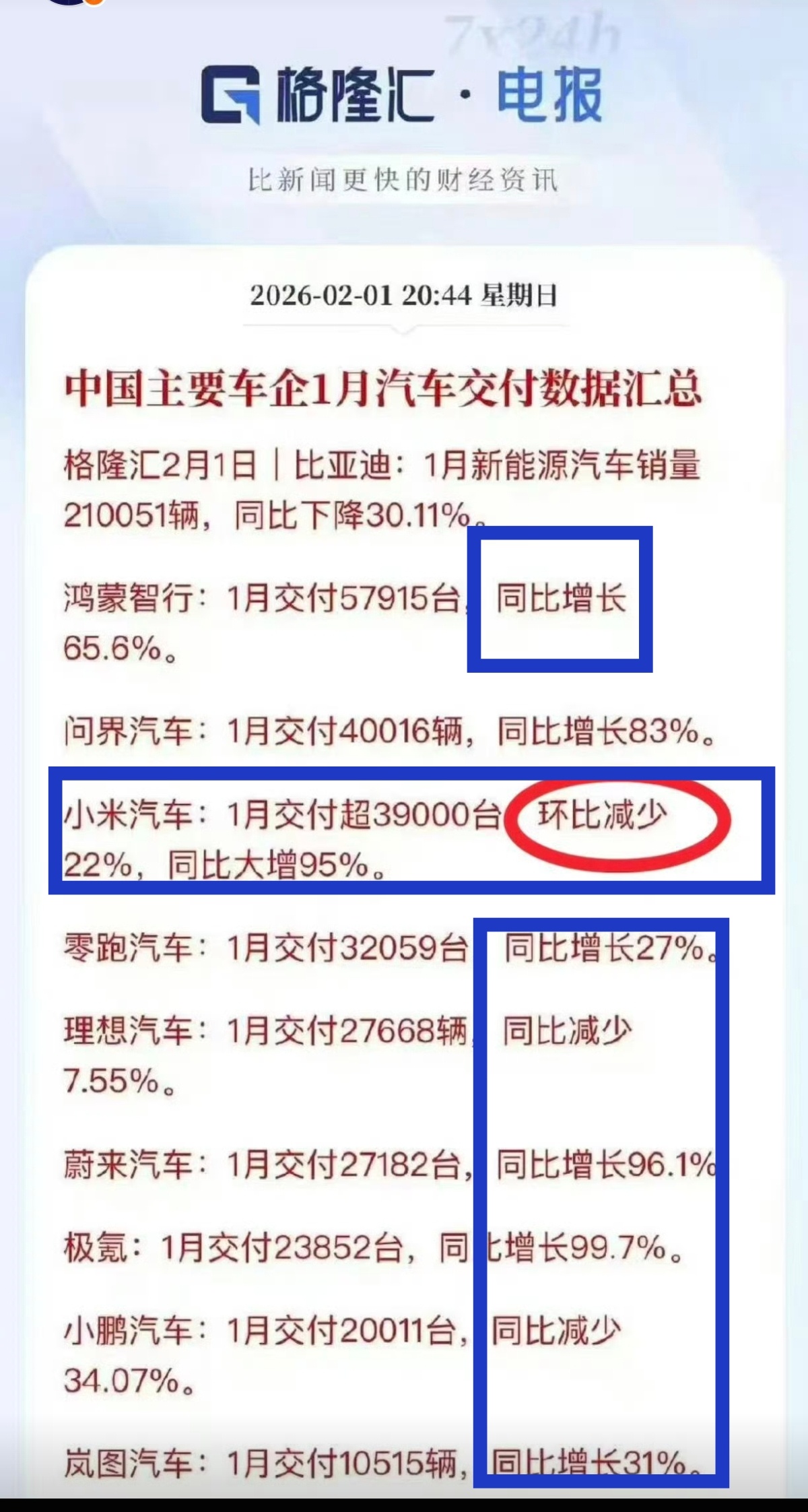 为什么只有小米汽车加上了「环比」?