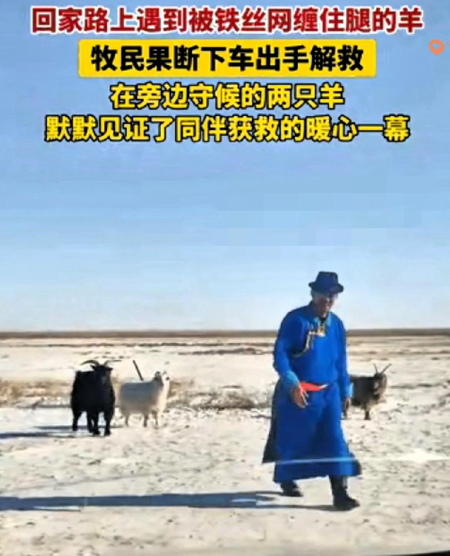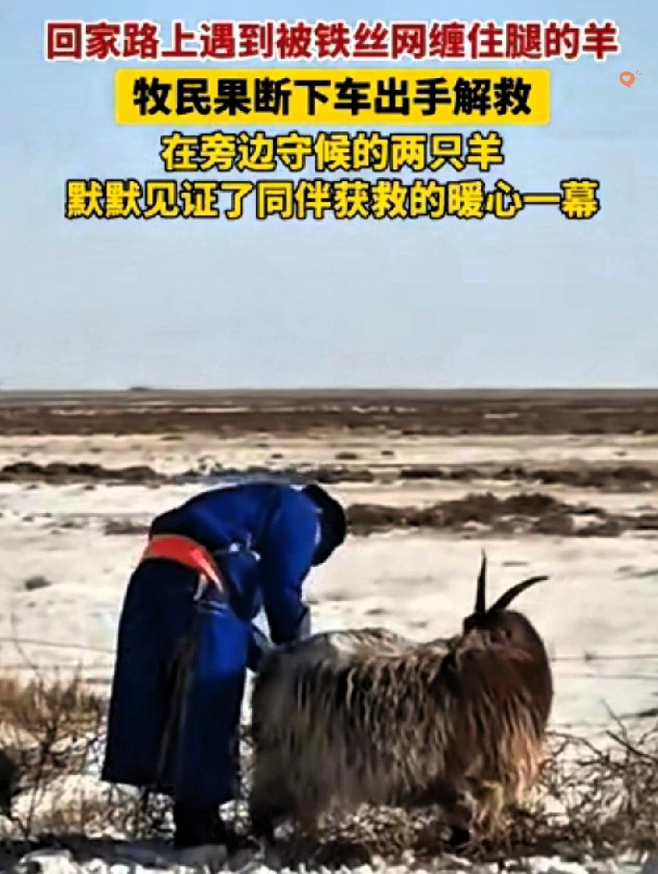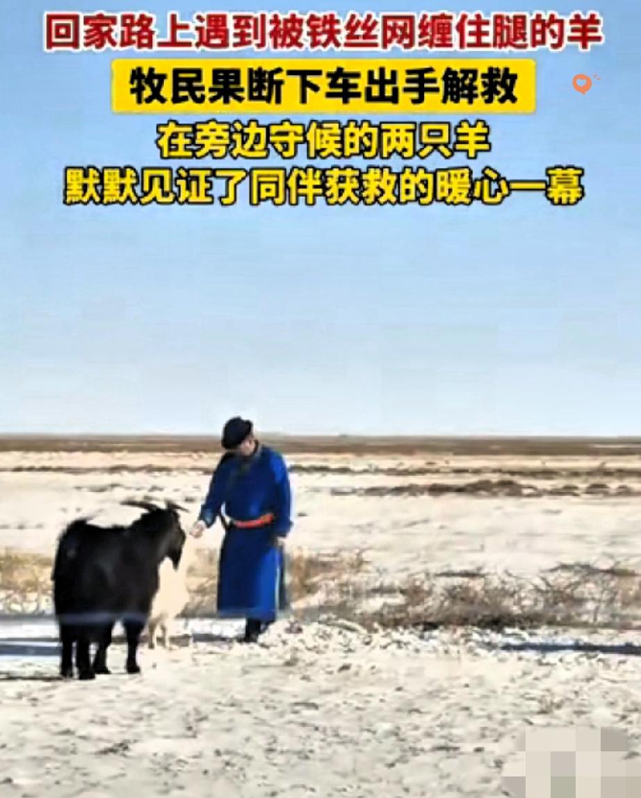 谁能想到,羊居然会组团求人帮忙,这波操作真的狠狠戳中我了! 内蒙古草原上这三只羊,把义气和灵性展现得淋漓尽致。 牧民驾车赶路时,两只羊突然拦在路边紧盯车辆,任谁看了都得纳闷,原来不远处还有一只同伴被铁丝网死死缠住,动弹不得,这俩是专门守在路边求救的。 换做别的动物,说不定早自顾自跑了,可这两只羊偏不,同伴遇险不抛弃不放弃,还能精准判断人类能帮上忙,这份聪慧和情义,哪里还有半分“傻羊”的标签影子? 以前总觉得羊温顺软弱,没什么灵性,如今才知道,是我们低估了这些生灵的共情力和智商。 它们不会说话,却懂守望相助,更懂感恩,获救后三只羊没有立刻逃离,齐齐站在原地目送牧民离开,这份无声的谢意,比任何言语都动人。 其实万物皆有灵,不是只有猫狗通人性,每一种生灵都有自己的情感和处事方式,这份纯粹的善意和义气,很多时候都值得我们人学习。 牧民的伸手相助暖了羊,羊的感恩和同伴的仗义也暖了我们,善意从来都是双向奔赴的,不分物种。 你们身边见过哪些特别有灵性的动物?有没有哪个瞬间让你觉得动物的情义特别戳心?