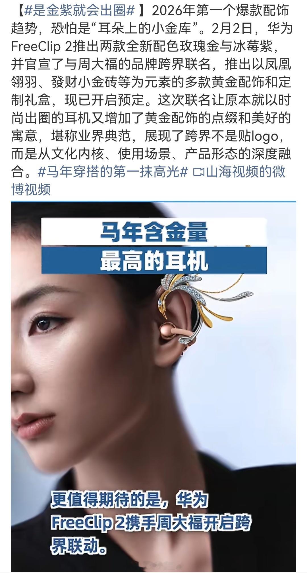 马年穿搭的第一抹高光华为FreeClip 2耳夹耳机今日上新玫瑰金、冰莓紫双新色,还携手周大福带来跨界联名惊喜,把马年新年的仪式感拉满了。