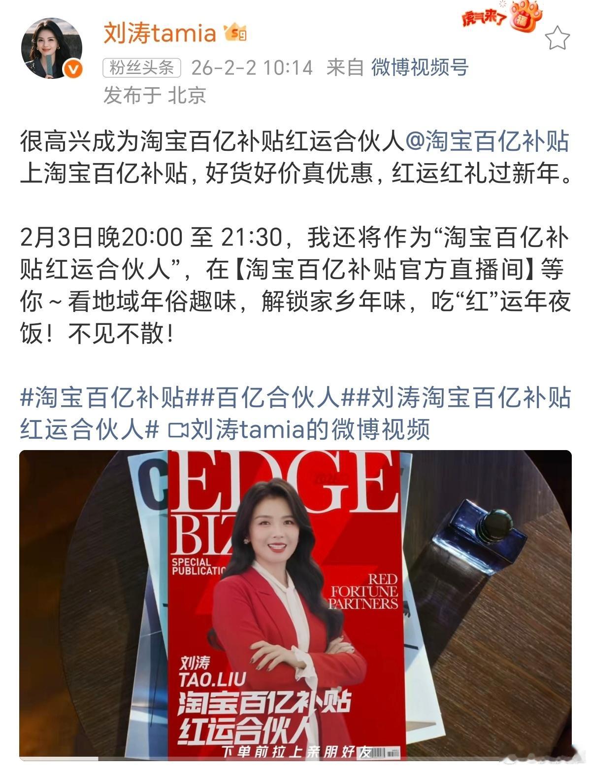 淘宝百亿补贴官宣:刘涛正式成为淘宝百亿补贴红运合伙人!科技先锋官