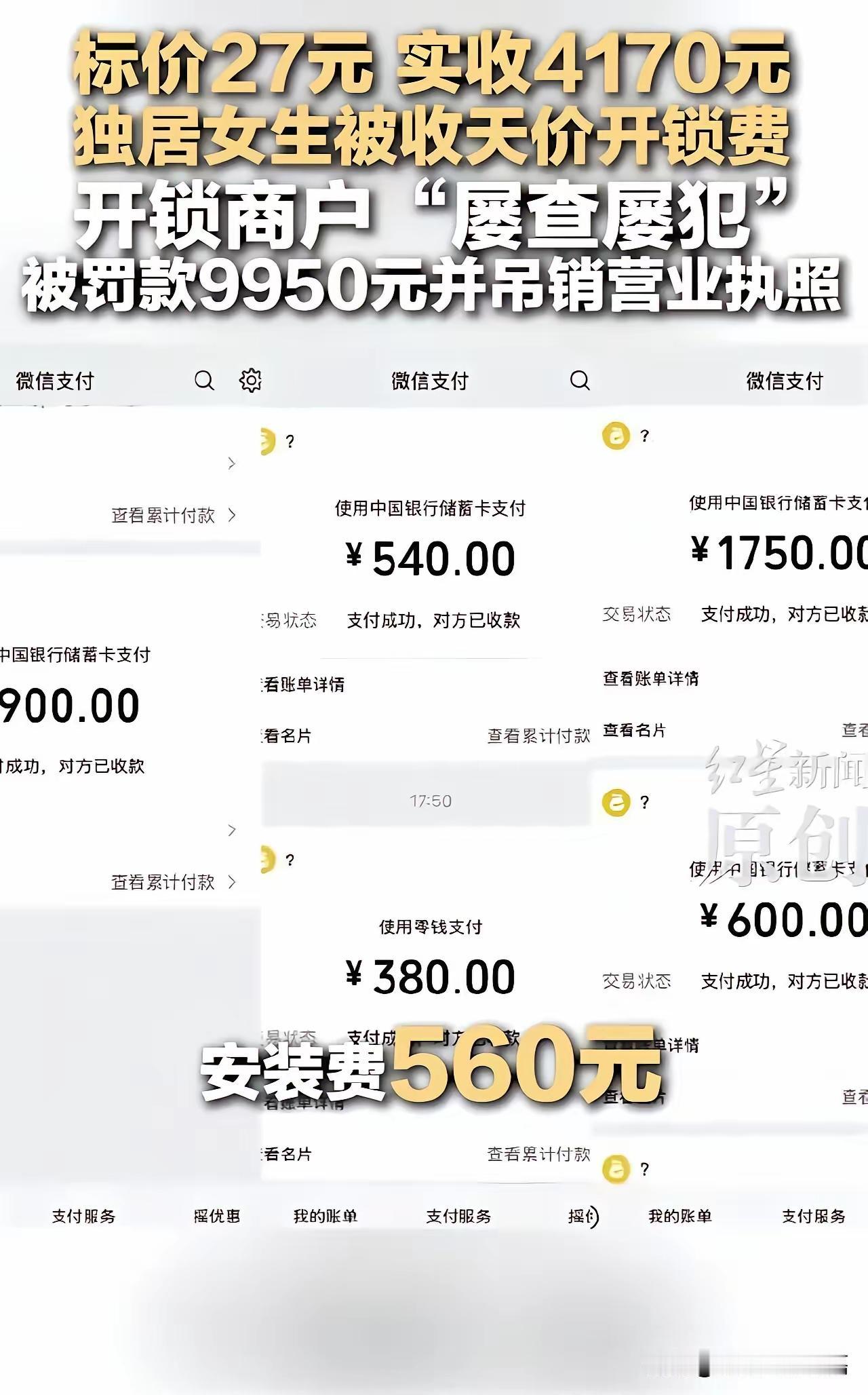 合肥独居女生被收天价开锁费后续来了!不仅4170元费用全额退还,涉事开锁商户还被罚款9550元、直接吊销营业执照!可网友看完处罚结果却炸了:“这样的惩罚还是太轻了!逮着独居女生往死里薅,半小时加价7次,简直是明抢!” 22岁的聂同学忘了带钥匙,在平台下单时明明标着“即刻开锁仅27元”,怎么也没想到,这竟是一场精心设计的“宰客陷阱”。开锁师傅上门后,先是谎称她的锁是C级防盗锁必须强拆,报出540元的“基础费”,等聂同学点头后,便开始了疯狂加价:拆完锁芯说锁体坏了,加380元;装完新锁要收公司服务费600元、个人安装费560元;见聂同学犹豫,又抛出调锁费300元、延保费600元;最过分的是,师傅离开半小时后竟折返回来,以“夜间服务+路程远”为由,再要900元。 半小时内,890元开锁费、560元安装费、300元调锁费、600元延保费、900元夜间服务费、540元面板材料费、380元锁体材料费,七项费用叠加,合计4170元!更让人心寒的是,聂同学作为独居女生,面对陌生师傅的强硬态度,只能被迫一次次转账,最后还被师傅拿出手机逼着录视频:“我自愿支付所有费用,无任何异议。” 那句被迫念出的话,背后藏着多少无助与恐惧? 谁能想到,这还不是商家第一次作恶!调查显示,涉事商户在2025年9月就因违反明码标价被处罚过,才过三个月就顶风作案,套路比上次更狠。更讽刺的是,商家事后还狡辩“上门师傅是外包的,跟我们没关系”,只同意退1000元了事。好在聂同学没有忍气吞声,坚持通过12315和平台投诉,保留了支付记录、沟通录音等关键证据,这才让监管部门顺利查实了商家“低价引流、拆分收费、胁迫留证”的全部违法事实。 监管部门的处罚可以说是大快人心:全额退还4170元违法所得,罚款9550元(相当于违法所得的5倍),直接吊销营业执照,让这家黑心商户彻底退出行业。可网友的愤怒依然没平息:“成本才200元,赚了1910元违法所得,罚款还不够狠!”“独居女生本来就弱势,这种宰客+胁迫的行为,就该终身禁业!” 网友的吐槽不是没道理,开锁作为特种行业,本应在公安备案、明码标价,可有些商家却利用消费者“急于进门”的心理,专挑独居者、夜间求助者下手,把紧急服务当成宰客的工具。 其实聂同学的遭遇不是个例。多少人遇到过类似的“上门刺客”?修水管的报价50元,上门后说零件坏了要收500元;通下水道的张口200元,完工后说难度大要加钱。他们吃透了消费者“已经开工不好反悔”的心理,一步步加价,让人进退两难。而独居女性、大学生这类群体,因为社会经验不足、缺乏安全感,更容易成为被拿捏的目标。 但这次事件也让我们看到了希望:监管部门没有纵容“屡查屡犯”的不良商家,用顶格处罚彰显了维护消费者权益的决心;更倒逼出了行业新规,安徽已经出台《锁业行业自律公约》,上线了正规开换锁服务平台,以后开锁再也不用怕被坑了。 在这里也给大家提个醒:遇到开锁、维修等上门服务,一定要选公安备案的商家,平台下单后别私下留联系方式,提前书面确认总价(含配件费、服务费);服务过程中全程录音录像,拒绝“先拆后说”的强制消费;如果遇到分批加价、胁迫付款,立刻叫停并报警,保留好所有凭证。记住,你的妥协只会让黑心商家更嚣张,勇敢维权才是对自己最好的保护。 最后想问大家:你遇到过“上门刺客”吗?面对这种宰客行为,你会选择忍气吞声还是坚决维权?欢迎在评论区分享你的经历和看法,一起曝光黑心套路,让更多人避坑。