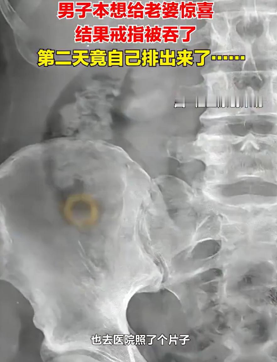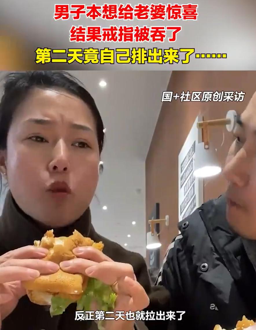 惊喜变惊吓了!湖南郴州,一男子准备过年前给妻子一个惊喜,就瞒着她买了一个金戒指藏到汉堡里,本想着妻子吃了一口后发现,结果妻子饿了吃一大口,把戒指一起吃进肚子,好在第二天排了出来 起初,侯先生觉得直接送金戒指少了点意思,便琢磨了个特别的法子,把新买的金戒指悄悄塞进汉堡里,等妻子吃着吃着突然发现,那才叫惊喜 计划倒是周密,可事情没按他想的来。那天妻子是真饿了,接过汉堡一大口咬下去,嚼都没细嚼,连着面包肉饼和里面藏着的戒指,全给咽了下去。等侯先生反应过来,妻子已经觉得喉咙不对劲,这才知道戒指被吞了 当时两人都懵了。侯先生后来回忆说,心里一下子就慌了,毕竟吞下去的是个金属物件。他们赶紧去了医院,拍片子确认戒指在胃里,医生说问题不大,让回家观察 果然,第二天戒指就随着排泄物出来了。侯先生把戒指仔细清洗消毒,这回没再搞什么花样,老老实实递到妻子手里。妻子看着他,又气又笑,说你这惊喜差点成了惊吓,下回可别再折腾了 生活中很多事都这样,我们精心策划,却忘了考虑最平常的变数。惊喜和惊吓之间,有时候就差那么一点点分寸 这也提醒我们,表达感情还是踏实点好。不是说不能玩花样,而是得考虑对方的习惯和实际情况。一份真心,有时候简单直接地递出去,反而更让人安心踏实。毕竟感情这东西,归根结底是两个人之间的理解和体贴,不是演给谁看的戏码