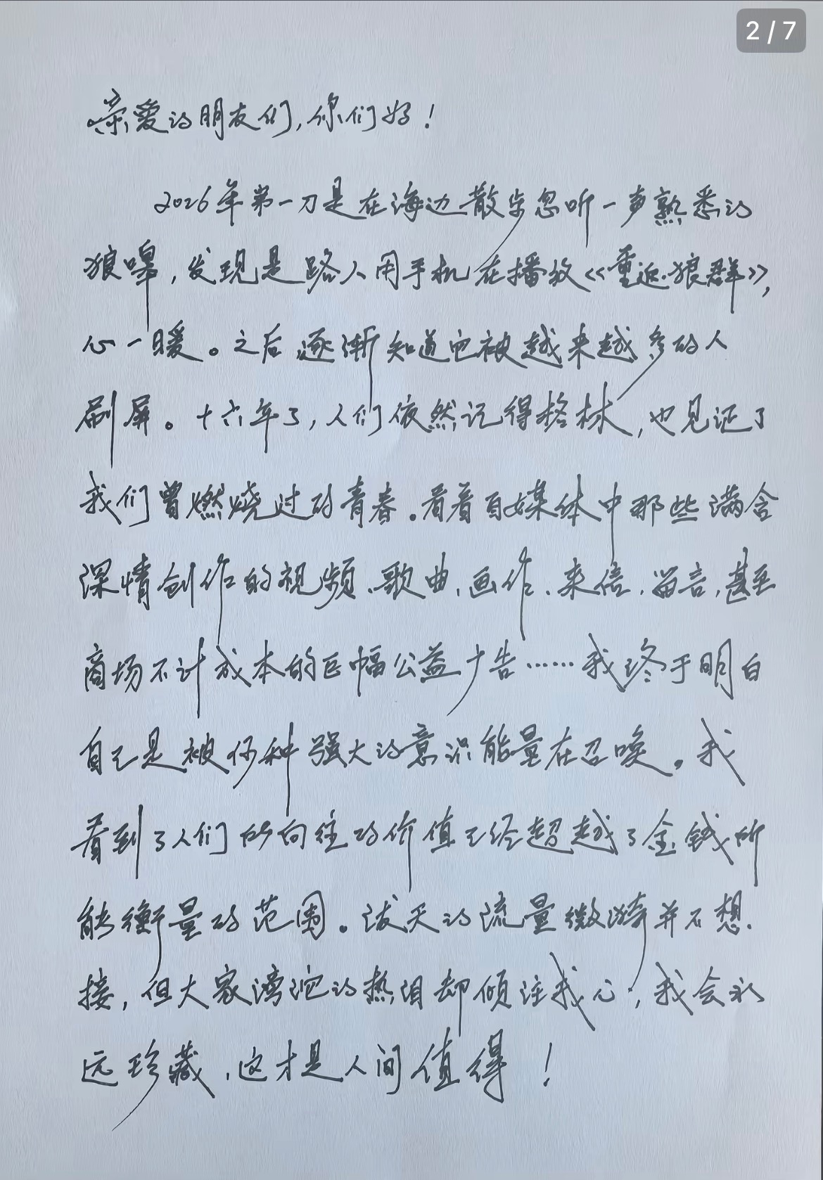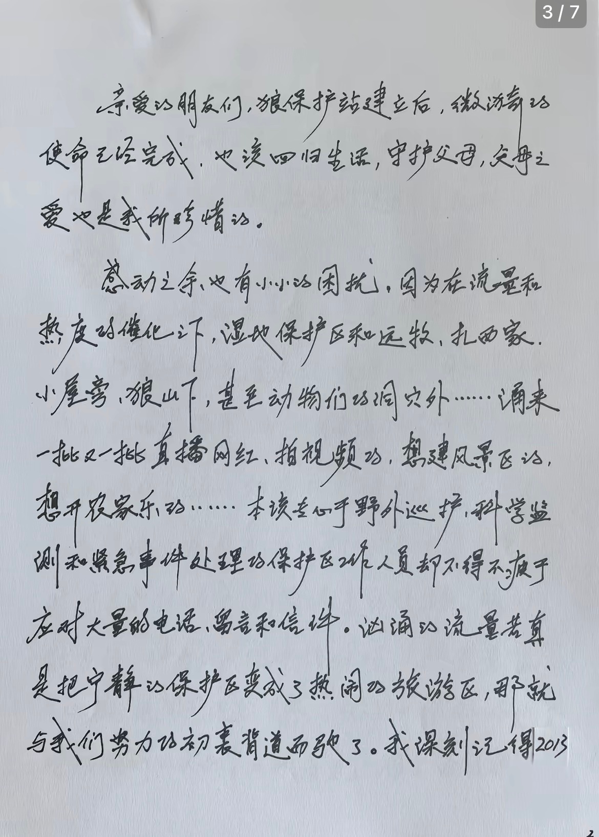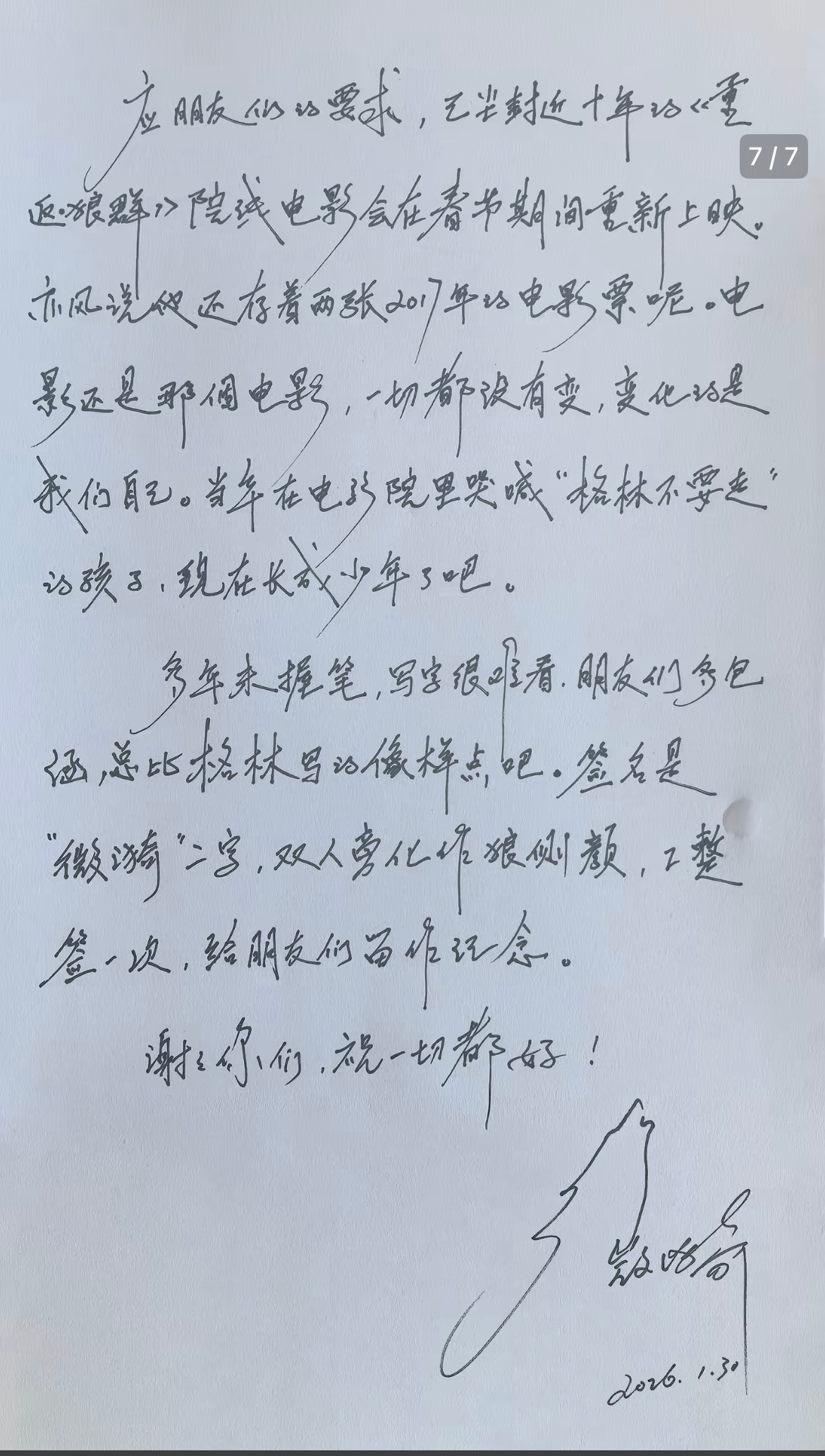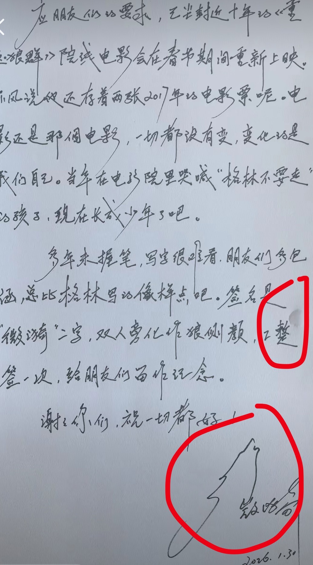 重返狼群女导演的手写签名是格林格林妈妈李微漪发了手写信,谈到将在春节重映《重返狼群》,并且最后一页的纸上有泪痕,签名是格林的简笔画“签名是‘微漪’二字,双人旁化作狼侧颜。”重返狼群 教会格林惧怕人类是妈妈的最后一课