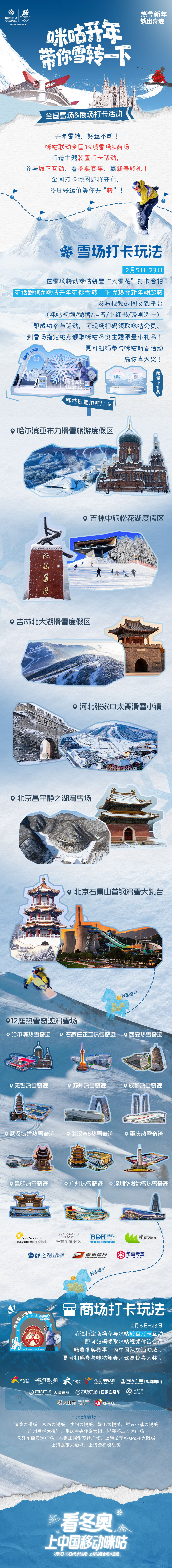 #咪咕开年带你雪转一下# #热雪新年翊起转# 全国19城冰雪集结,打卡地图即将开启,咪咕喊你赴约!2月5日起指定雪场、2月6日起指定商场开启打卡限定装置,持续至2月23日,现场可解锁咪咕会员、新春周边等好礼,冬日好运值等你来“转”!❄️💌更多具体玩法详见长图#看冬奥上咪咕# #热雪新年转出奇迹# 这个冬天,跟着咪咕一起开年“雪转”好运,为中国队加油助威!