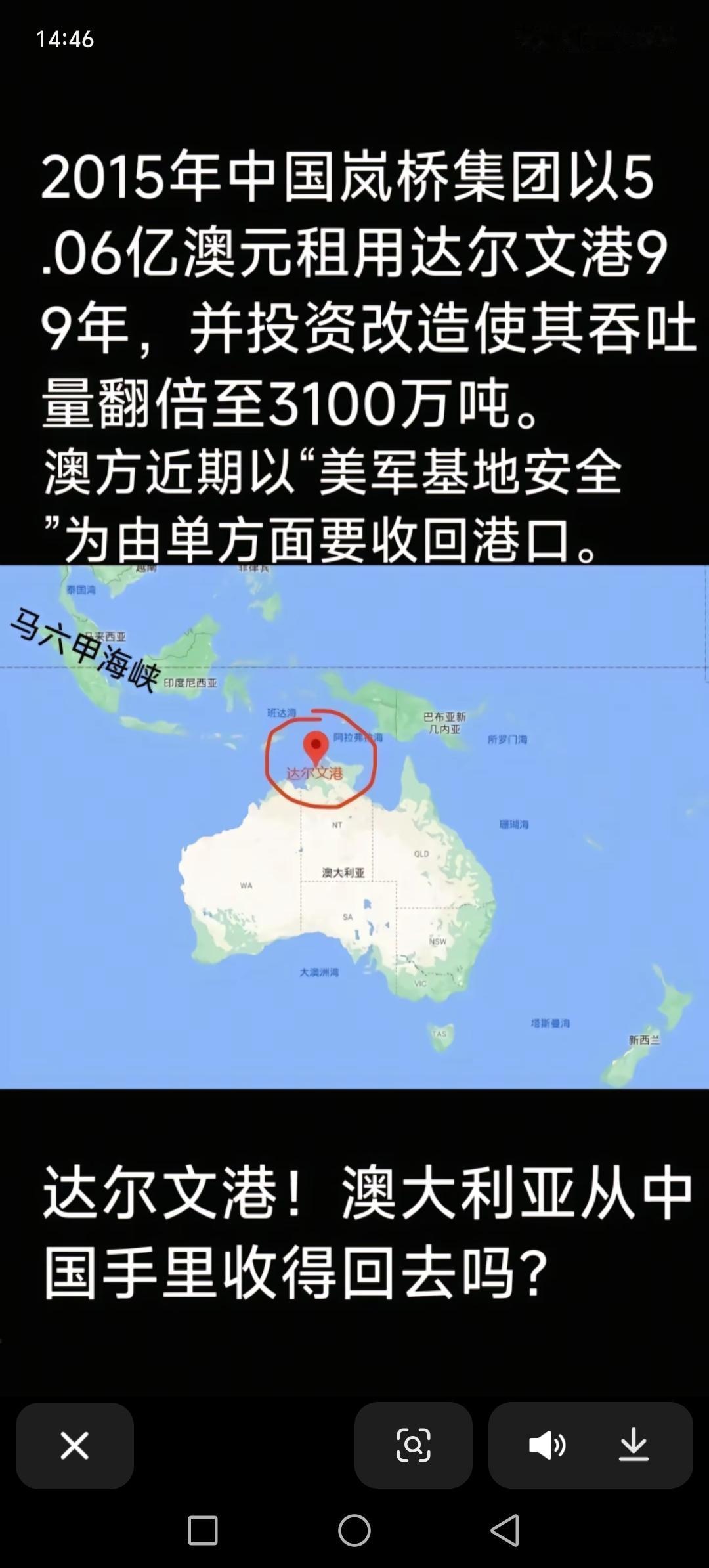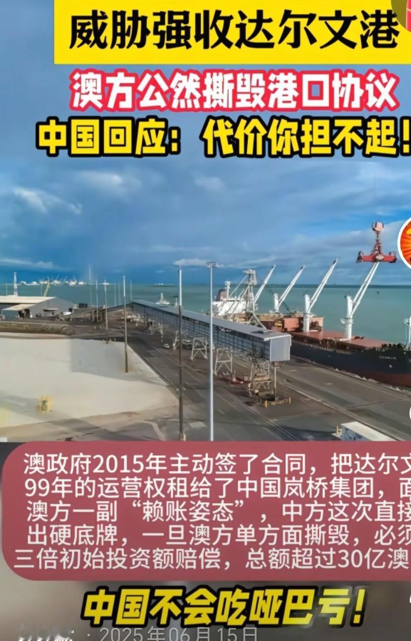 澳大利亚的达尔文港,澳大利亚威胁要强制收回,要单方面撕毁协议。2015年欢迎我们去投资,而且是澳方同意签的合同,现在却翻脸不认人。原来这个港口是无人问津,这个赔钱的港口,在中国的苦心经营下,港口吞吐量剧增,达到3000万吨。原来是亏损的,现在转为盈利,澳方却要收回,我们是坚决不同意。这份合同签约期99年,到时间还早着呢。再说我们也没有违规,你找的理由是借口,违反国家安全为由。世人皆知,澳大利亚是受美国的施压,将给收回。我们是绝不答应你,你是没有正当理由的,强制收回是违反合约的,要有天价的赔偿,至少几十亿澳元。就算你赔得起,我们也不干。 中国是澳大利亚的最大贸易伙伴,前几年就因为政治原因,两国闹起外交风波,澳大利亚后来认识到错误,逐步和我们搞好关系,现在又想翻脸,我们也不是吃素的。澳大利亚有不少的矿产产品是卖给中国,尤其是铁矿石,葡萄酒我们是他的最大买方。不要搬起石头来砸自己脚,最后损坏自己的利益。