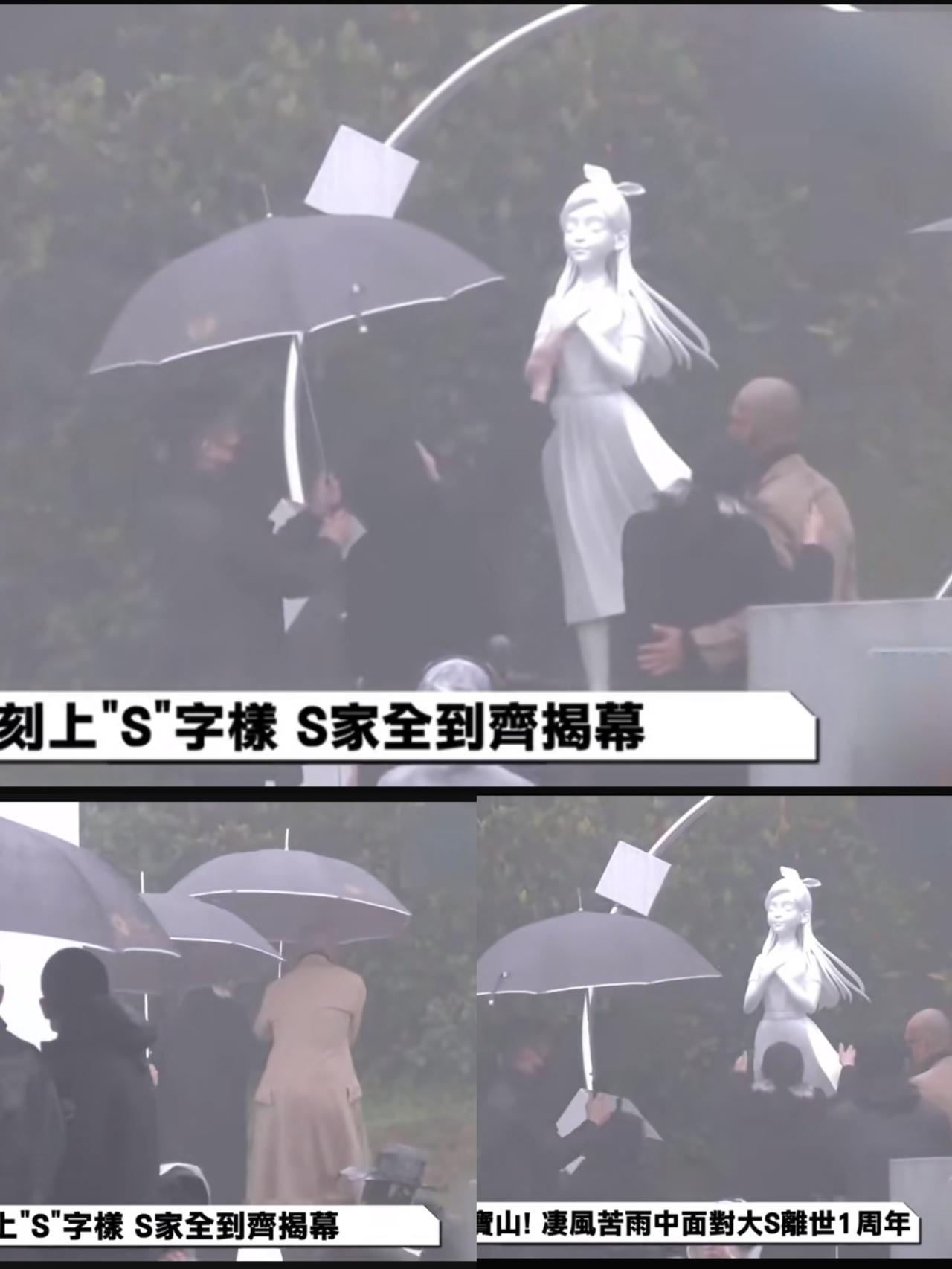 又是一个下雨天。 大S逝世一周年,她的纪念雕像在今日揭幕。 具俊晔暴瘦现身,大S的妈妈还有徐熙娣夫妇来到现场,参加了揭幕仪式。 大S的雕像用粉红色的布遮盖着。 具俊晔细心的解开幕布上的彩带,他们全家一起为大S死的雕像揭幕。 具俊晔设计的大S是一个天真灿烂的小孩的样子。她双手交叠放在胸前,闭着眼睛,像天使一样在祷告。 S妈妈抱着雕像落泪,小S也上前伸手抚摸雕像的手,也许她只是想握一下姐姐的手。 具俊晔跟大S的妈妈拥抱,又细心的为她撑伞。 很多人说这个雕像一点都不像大S.也许这才是具俊晔心中的大S吧!他把大S永远的留在了初见的时候。那时候的大S就是一个少女,很天真。不是,成年后的大S,为了别人,自己不得不像一头勇敢的狼。 这又是一个下雨天,跟大S下葬的那一天,多像啊。也许上天都在为她流泪吧?台湾明星大s
