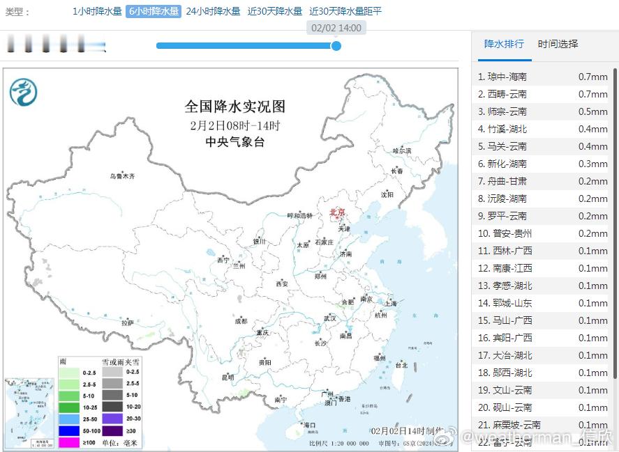 【降水稀少】今天08-14时,我国雨雪稀少。没有国家气象站6小时降水量超1毫米。最大为海南琼中和云南西畴,都是0.7毫米。而且从单小时降水看,11-14时,又凑不齐10个站。13时只有云南马关,单站上榜。今天下午到明天中午,我国降水依然不多,零散分布在西藏、青海、甘肃、四川、贵州、云南、台湾等地。