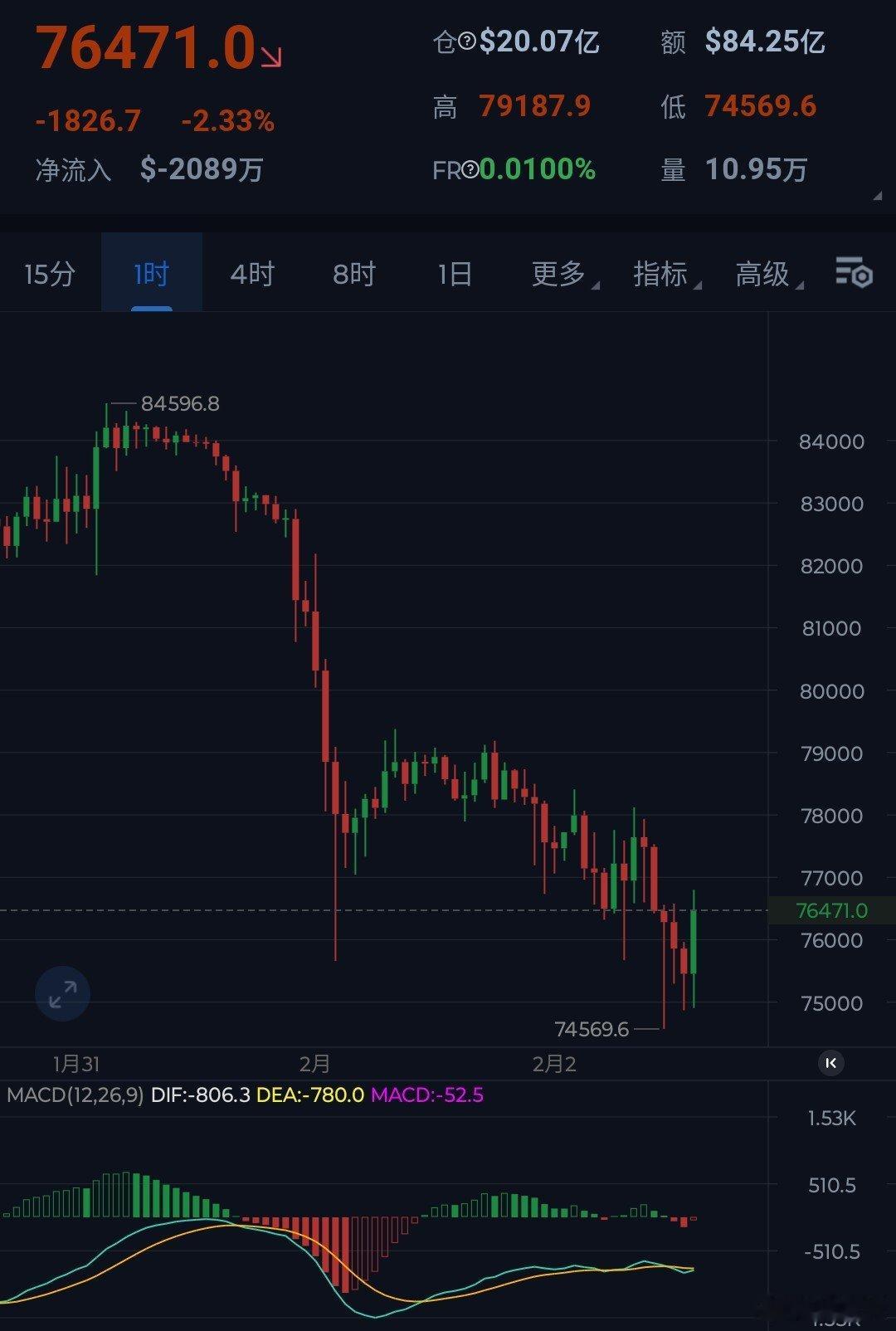 大饼下探至7.45万附近,完美的测试2025年4月初低位。越是这个时候宁愿观望也不可追箜,我想多,但是怕被你们黑,但我始终坚信大跌之后必然有一波反弹。