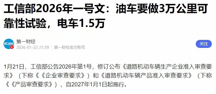 工信部新规出台后,所有的车企都必须要严格遵守的一项规定就是:油车要做3万公里可靠性试验,新能源汽车则是1.5万公里!它们的测试目标是检验机械耐用性(发动机、变速箱、底盘等)或者三电系统安全性!所有的上市车辆都需要按照标准完成试验并提供合格报告,试验过程的部分项目还需要提供录像备查的!