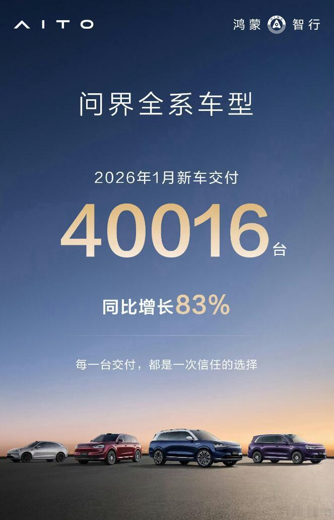 在车圈整体都有点萎靡的时候,鸿蒙智行给增添了一大把热度。1月份,鸿蒙智行交付总量57915台,同比增长65.6%,这是一个非常亮眼的数字。其中问界自己就交付了40016台,同比增长83%。要知道,1月份很多新势力品牌的交付量都远不如去年同期,而鸿蒙智行能够“逆势升温”,说明确实有不少干货。比如说经久不衰的问界M9,蝉联50万级豪华SUV销冠;而问界M8、全新问界M7等车型,也在各自的价位段里成绩斐然。同时,今年还要上新的车子也不少,问界M6当属一匹黑马,智界V9有望重塑豪华MPV市场格局,尚界Z7则对小米SU7虎视眈眈。2025年,鸿蒙智行交出了一份堪称满分的答卷,那么2026年又是个产品大年,大家是不是更期待了?鸿蒙智行1月交付57915台问界鸿蒙智行鸿蒙智行2025中国新势力年度销冠
