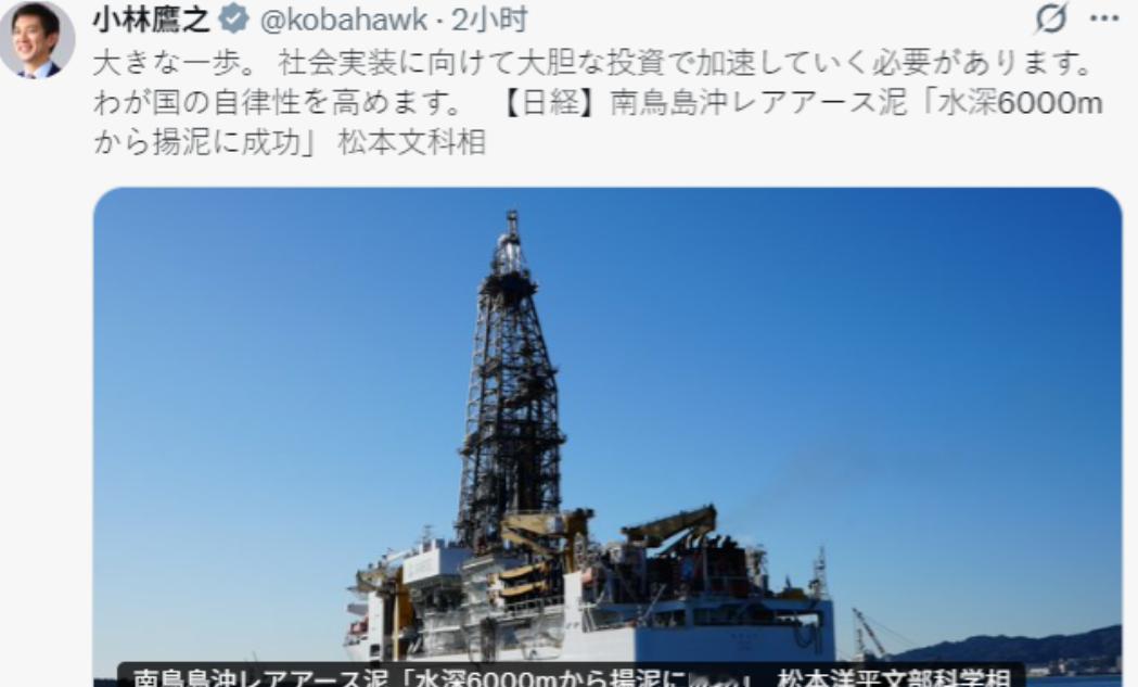 2 月 2 日,日本从 6000 米深海捞出 “稀土泥” 一事,可把日本政客高兴坏了。日本自民党政务调查会长小林鹰之今天(2 月 2 日)亲自发文:“迈出重要一步!为实现社会应用,需要通过大胆投资来加速推进,提升日本的自主性!” 这番高调表态,把日本政客的急切心态摆得明明白白,说白了就是被中国的稀土管制逼到了墙角,好不容易捞上来一船深海泥,就像抓住了救命稻草,恨不得立刻吹成摆脱资源依赖的 “世纪突破”。 日本作为资源小国,稀土一直是命门所在,尤其是镝、铽这类重稀土,是电动车马达、半导体芯片、精密磁体的核心原料,日本的依赖度长期卡在 100%,全靠中国供应。 2026 年 1 月中国加强两用物项出口管制,直接掐住日本产业的咽喉,丰田、本田的新能源生产线被迫减产,部分车型停产待料,信越化学、JX 金属这些日本材料巨头订单暴跌,野村研究所测算,管制持续三个月,日本产业损失就超 6600 亿日元,持续一年更是要亏掉 2.6 万亿日元,直接拉低 GDP0.43 个百分点,汽车、半导体两大支柱产业摇摇欲坠,日本政客再不找点 “突破”,根本没法向国内企业和选民交代。 这次日本捞上来的深海稀土泥,来自东京以南 2000 公里的南鸟岛海域,官方宣称储量达 1600 万吨,镝、钇等关键元素够全球用数百年,听着确实吓人,可扒开数据看,全是纸面富贵。 日本出动的 “地球号” 钻探船,光是伸到 6000 米海底的扬泥管就花了 120 亿日元,整个试采作业持续一个月,最终只抽上来 35 吨泥,提取出 70 公斤稀土,折算下来每公斤稀土成本高达 12 万美元,是中国陆地稀土开采成本的 150 倍,而国际市场稀土均价不过 1000 美元一公斤,这样的成本,别说商业化应用,就算日本政府全额补贴,企业也用不起。 日本海洋地球科学技术厅自己都承认,南鸟岛偏远偏僻,运输和处理泥浆的成本远高于直接进口,哪怕技术成熟,成本也是陆地矿的 10 倍以上,短期根本没有商业化可行性。 更关键的是,深海稀土泥的提取难度,比陆地矿难上百倍。6000 米深海相当于 550 个大气压,设备故障风险极高,这次试采就多次出现管道堵塞、泵机停机的问题,所谓的 “成功捞泥”,不过是小规模技术验证,离大规模开采差着十万八千里。 而且深海泥里的稀土元素分布极散,富集度远低于陆地矿,日本至今没有掌握高效分离提纯的核心技术,中国的串级萃取工艺全球独一份,能把稀土纯度提到 99.99%,日本就算把泥全捞上来,也没法高效分离出可用原料,最后还是要依赖中国技术,所谓的 “提升自主性”,不过是自欺欺人。 日本的深海稀土计划,早就不是第一次喊口号了。2012 年发现南鸟岛稀土泥,2019 年高调宣布启动开发,2022 年只在 2500 米浅海完成小规模试验,2024 年的深海试采因英国设备交付延迟推迟到 2026 年,每次都是高调造势,实际进展拉胯。 日本政府嘴上说 “大胆投资”,可财政早就不堪重负,国家债务占 GDP 比重超 260%,2026 财年国债利息支出就达 31.3 万亿日元,占年度预算四分之一,还要提前兑现防卫费 GDP 占比 2% 的承诺,上千亿美元军费砸向军工,根本拿不出持续投入深海开发的资金,所谓的 “加速推进”,不过是用财政窟窿填政治作秀的坑。 小林鹰之的喊话,本质是选举政治的套路。2026 年日本面临大选,高市早苗内阁支持率持续下跌,经济衰退、产业困境、民生压力层层叠加,执政团队急需一个 “突破性议题” 转移视线。 深海稀土捞泥,正好成了最好的道具,政客们把技术验证吹成产业突破,把成本畸高的试验吹成 “自主希望”,就是为了告诉选民和企业,政府正在解决稀土依赖问题,至于能不能落地、什么时候能用,从来不在他们的考虑范围内。 日本企业界心里也清楚,深海稀土远水解不了近渴,丰田、本田依旧在疯狂囤积中国稀土库存,半导体企业依旧在申请中国出口许可,所谓的 “深海突围”,不过是政客们的自我安慰。 日本政客们高兴得太早,捞上来的不是稀土宝藏,而是一堆成本畸高、难以利用的深海泥,所谓的 “重要一步”,不过是选举造势的一步,离真正摆脱稀土依赖,还差着几十年的路。 日本的资源困境,从来不是靠深海捞泥能解决的,政客们与其画饼造势,不如正视现实,放弃对抗思维,回到正常的经贸合作轨道,可在右翼执政的当下,这样的选择,显然比从深海捞稀土还要难。
