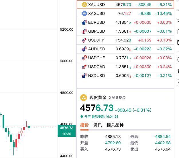 今天黄金继续大幅回落, 国内沪金盘中一度跌停。 刚看了眼伦敦金走势情况。 虽然现货黄金(伦敦金) 最低跌至4402.98美元, 不过现在报价4578.73美元, 虽然还是较上一日下跌308.45美金; 但是和最低价相比, 是否可以说低位反弹180美元? 黄金止跌回升在即, 而且暴跌以后,经常会发生超跌反弹行情!