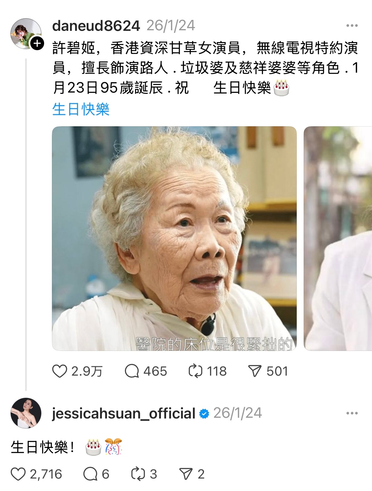 TVB御用婆婆许碧姬95岁生日,宣萱送祝福。