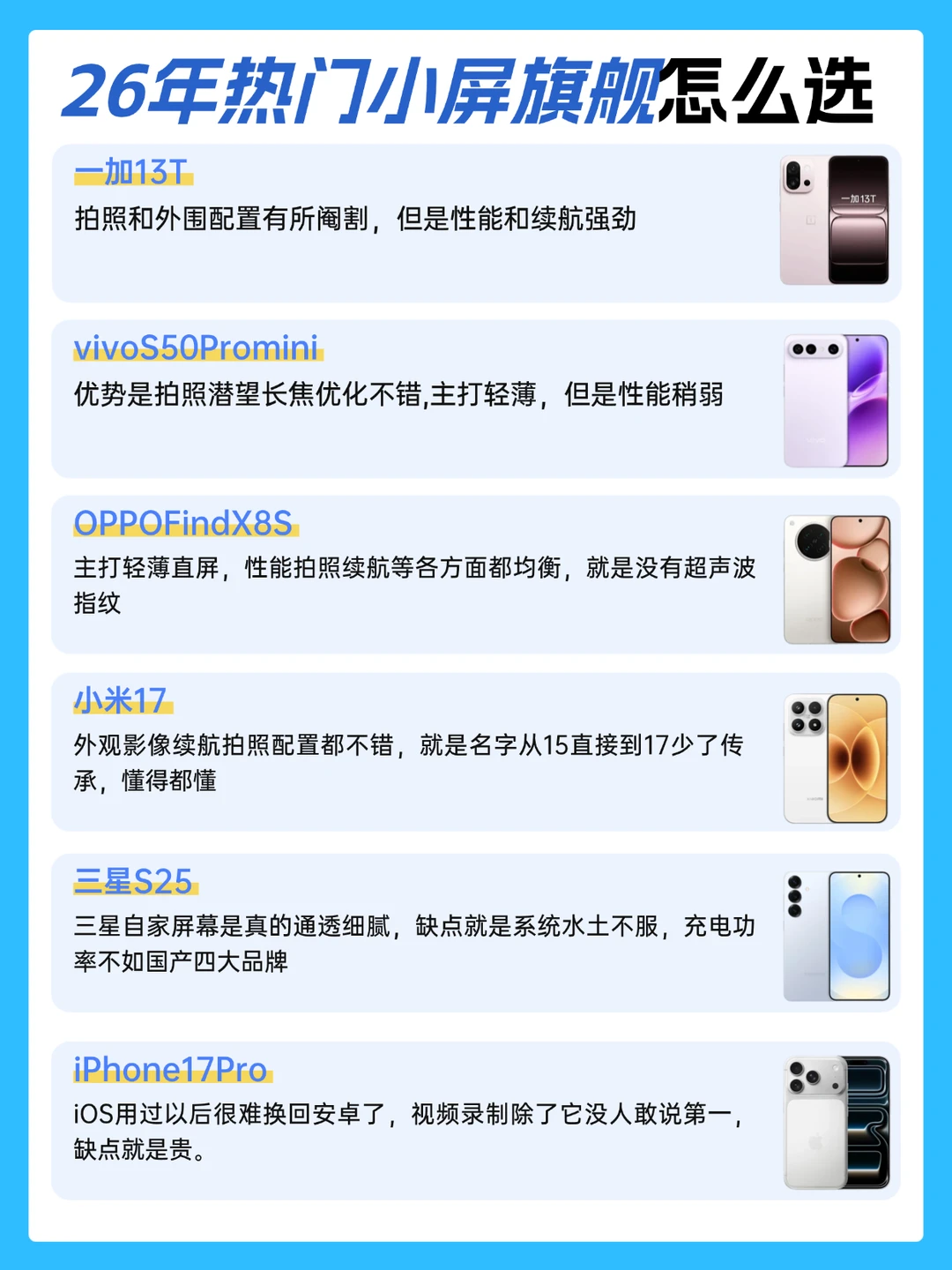 2026年最新最全热门小屏旗舰手机对比|推荐 1⃣一加13T 拍照和外围配置有所阉割,但是性能和续航强劲 2⃣vivoS50Promini 优势是拍照潜望长焦优化不错,主打轻薄,但是性能稍弱 3⃣OPPOFindX8S 主打轻薄直屏,性能拍照续航等各方面都均衡,就是没有超声波指纹 4⃣小米17 外观影像续航拍照配置都不错,就是名字从15直接到17少了传承,懂得都懂 5⃣三星S25 三星自家屏幕是真的通透细腻,缺点就是系统水土不服,充电功率不如国产四大品牌 6⃣iPhone17Pro iOS用过以后很难换回安卓了,视频录制除了它没人敢说第一,缺点就是贵。