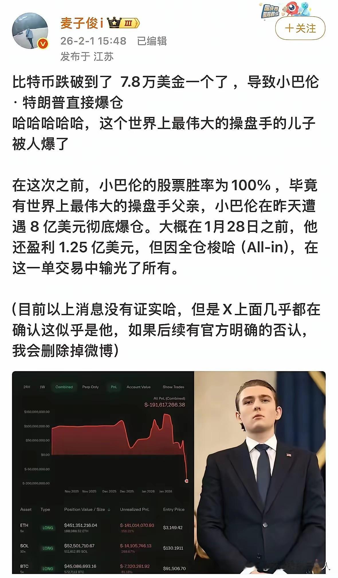 看到特朗普儿子巴伦因比特币暴跌,直接被爆仓8亿美元的新闻,我忽然想起2026年初