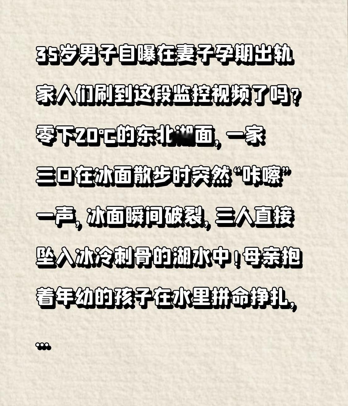 35岁男子自曝在妻子孕期出轨 家人们刷到这段监控视频了吗?零下20℃的东北湖面,