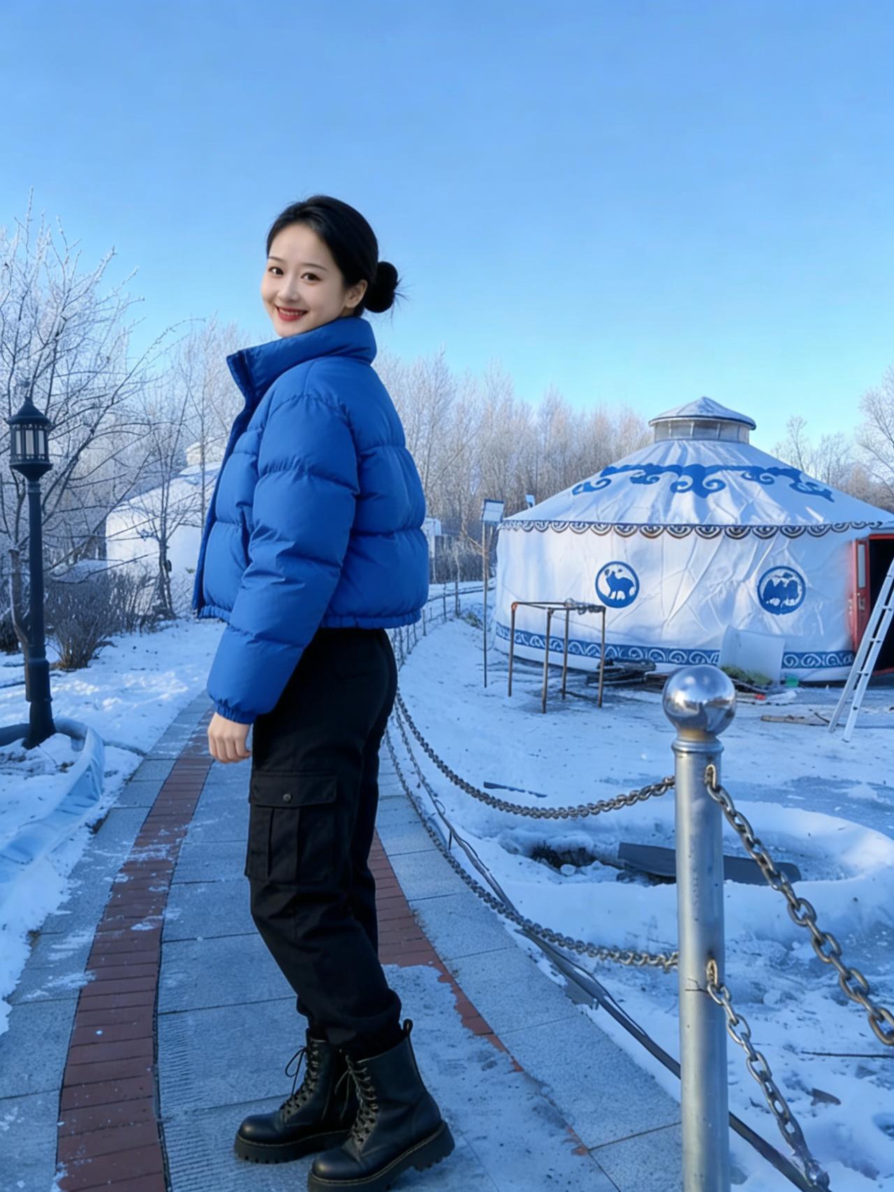 蓝袄黑裤踏雪行,毡包遥对暮云平。 一笑可融千岭雪,何须桃杏斗春明。