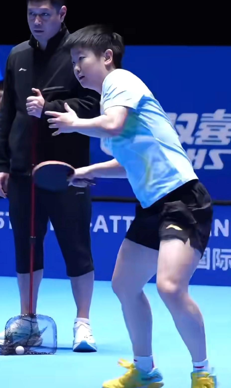 莎莎适应场地训练, 大家最关注的就是她的双脚, 还有站在莎莎后边的邱贻可指导。