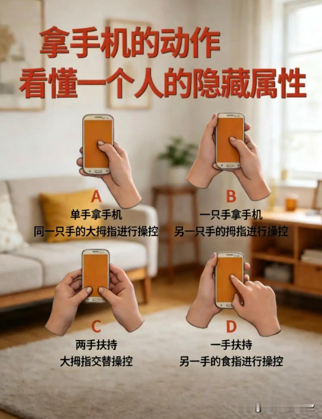 - A. 单手拿手机,同一只手的大拇指操控 这类人通常自信果断,习惯掌控节奏,做事不喜欢依赖他人。他们性格独立,适应能力强,在社交中往往是主动主导的一方。 - B. 一只手拿手机,另一只手的拇指操控 这类人注重细节,心思细腻,安全感需求较高。他们习惯提前规划,做事稳扎稳打,在人际关系中更倾向于谨慎观察、慢热深入。 - C. 两手扶持,大拇指交替操控 这类人性格温和包容,乐于协作,擅长倾听与配合。他们不喜欢冲突,习惯在团队中扮演调和者的角色,同时也有较强的耐心和专注力。 - D. 一手扶持,另一手的食指操控 这类人通常思维活跃,好奇心强,对新鲜事物充满探索欲。他们喜欢打破常规,不满足于固定模式,在生活中也常常是点子多、脑洞大的创意型选手