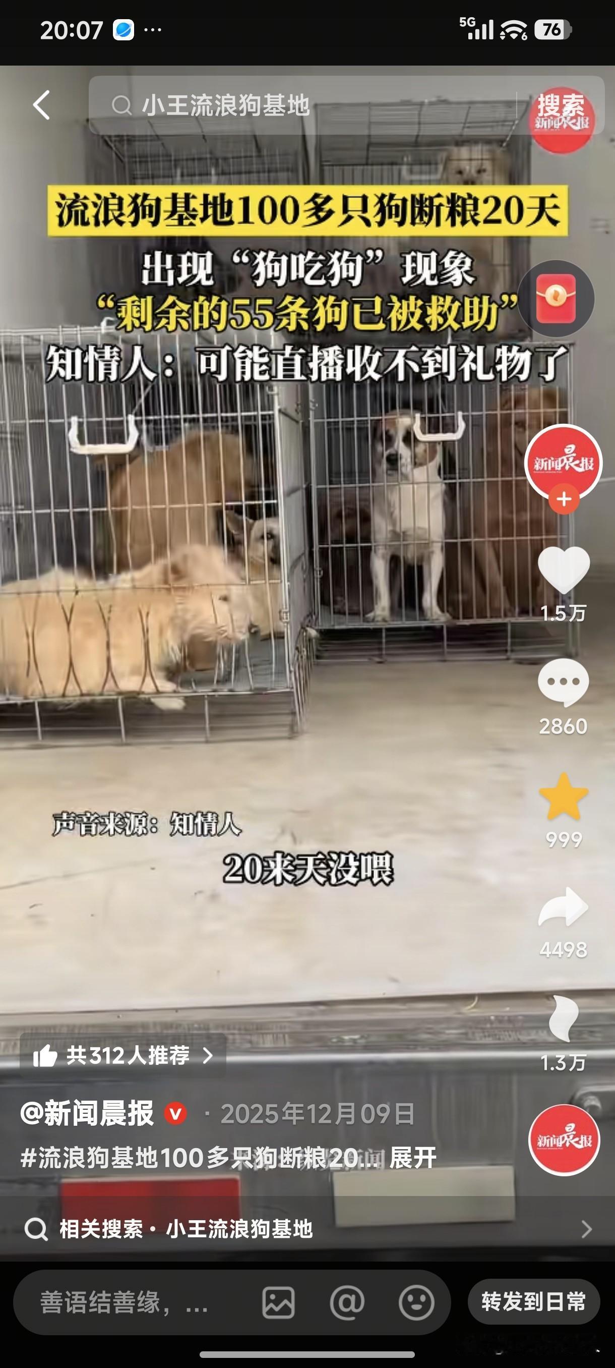 “流浪狗救助基地”是在虐狗还是在救狗! 网上看见,一流浪狗救助基地100多只狗断粮20多天,出现“狗吃狗”现象,剩余的55条狗已被人救助。据知情人士透露:可能直播收不到礼物了。 “救助流浪狗”是直播话题,流浪狗基地是直播道具,流浪狗是用来博人眼球赚取流量的热点。这样的“救助基地”,这样的“爱心人士”,爱心真的“喂狗”了吗!