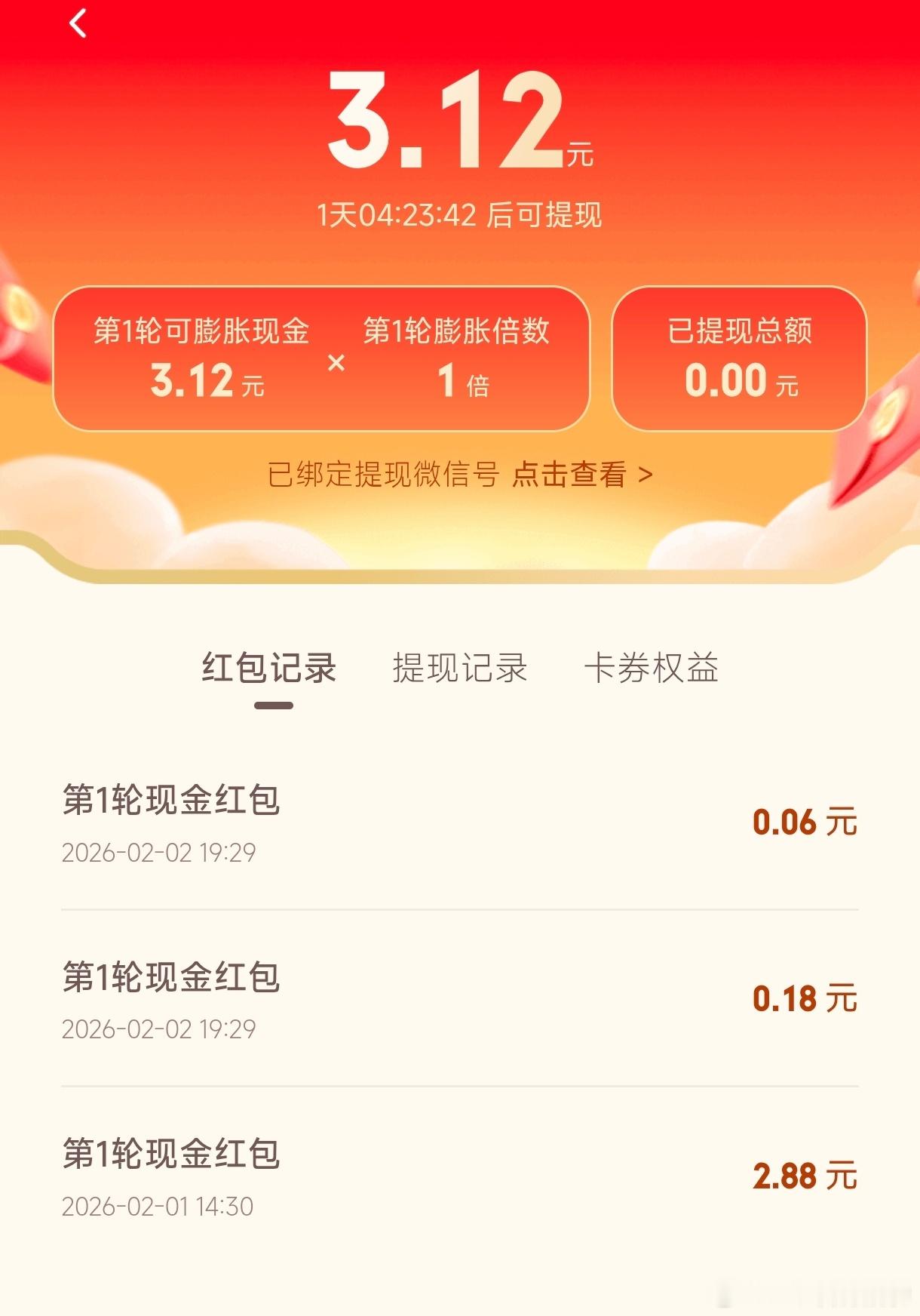 腾讯元宝红包两天赚了3.12元最终可以提现吧?