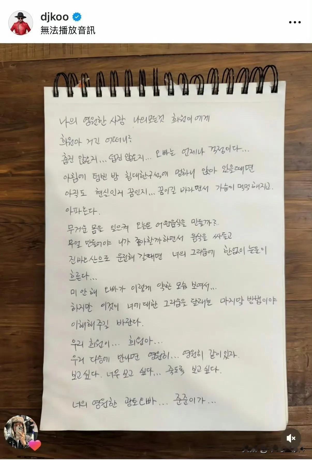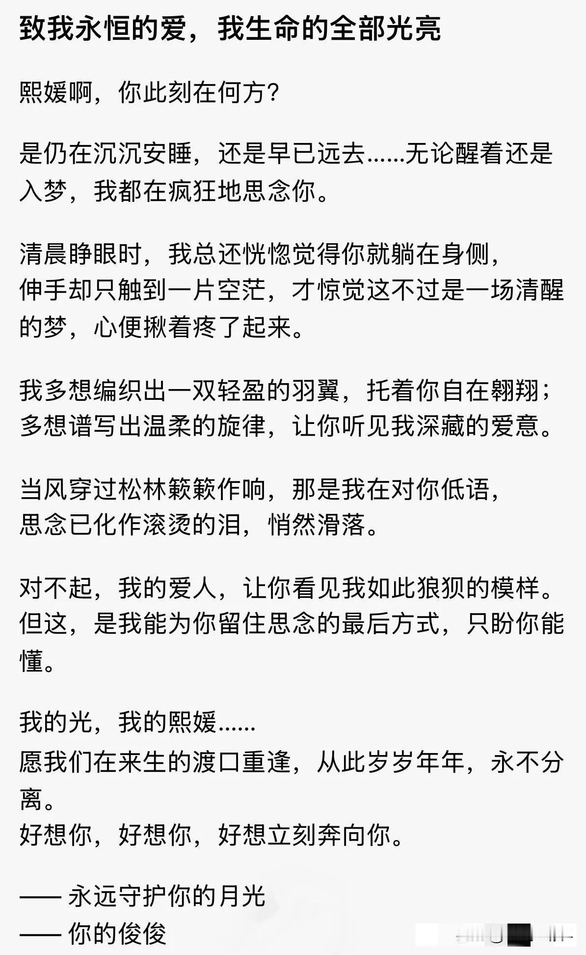 大S去世一周年,具俊烨罕见发文,亲手写了一篇小作文,致爱妻大S,真是痴情呀! 看得出具俊烨满满的不舍和思念,大S是他生命里的光,失去大S,仿佛具俊烨的魂也跟着走了,有自责也有遗憾,具俊烨余生都会守护爱妻,来生希望相逢,永不再分离。 感觉具俊烨的小作文,整个人都快碎掉了,讲真,真的是有太多遗憾了,年轻的时候相爱不能在一起,到了中年,想用余生守护的时候,爱人突然离世了,真是撕心裂肺的痛呀,如果可以预知未来,估计具俊烨会拼了命救大S吧!
