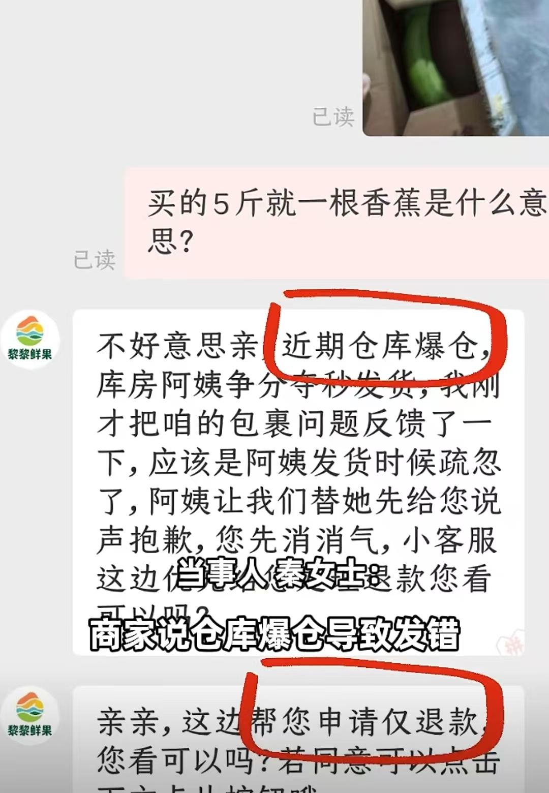 这也太尴尬了吧!女子网购9斤香蕉送亲戚,结果商家只发1根!女子:“只退了钱,其他