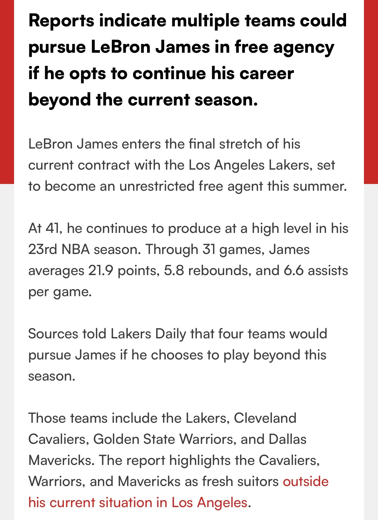 据《Lakers Daily》的消息源透露,若詹姆斯选择继续打球,有4支球队会对他展开追逐,包括湖人、骑士、勇士和独行侠。报道特别指出,骑士、勇士和独行侠是湖人之外的“新追求者”。