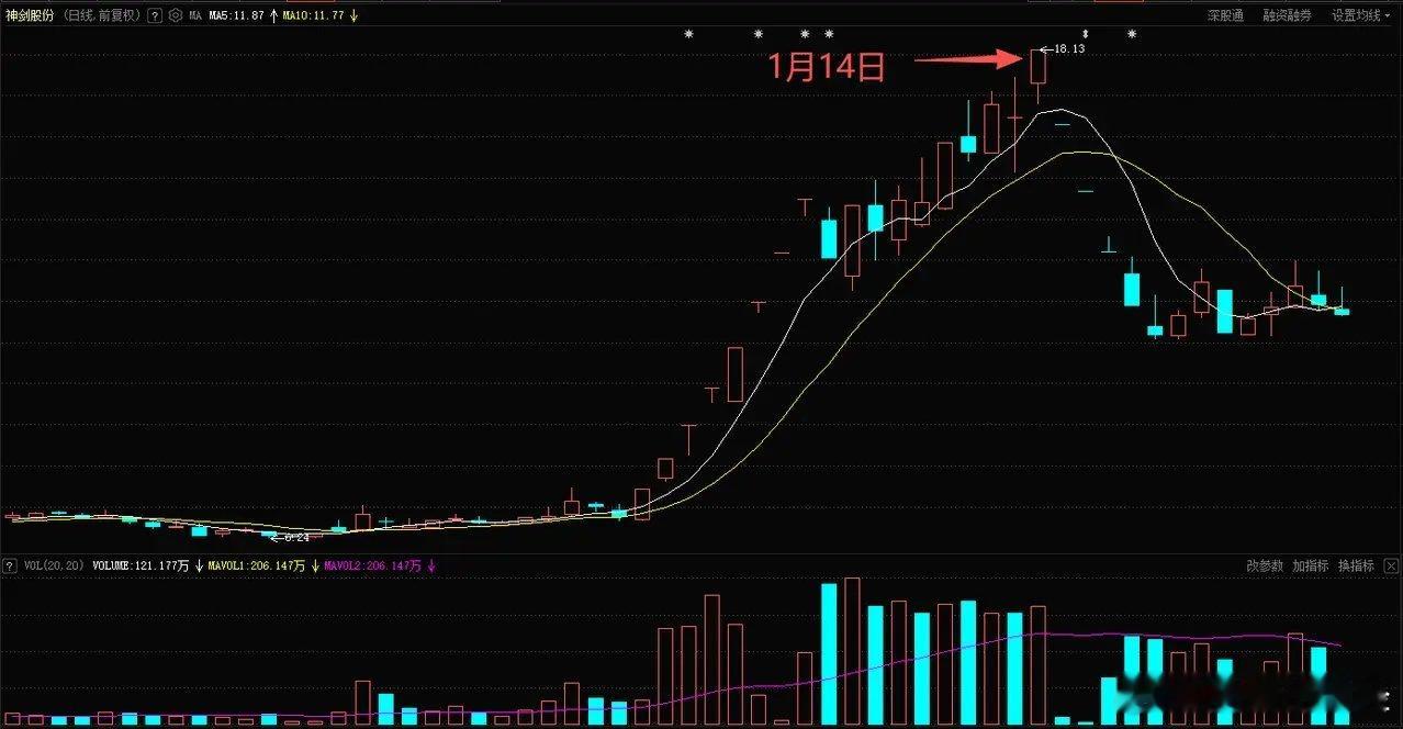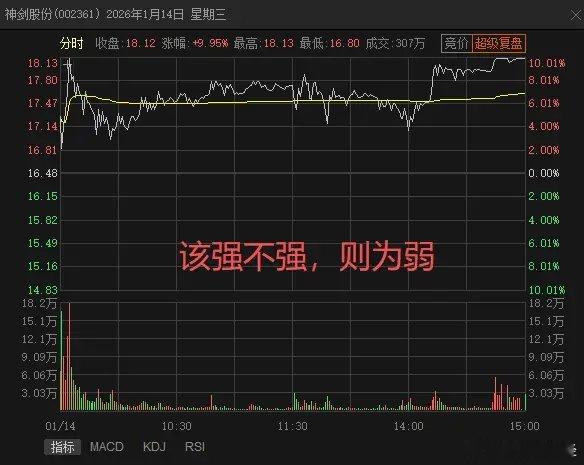 再比如2026年1月14日,神剑股份高开4.98%,开盘超预期了,开盘不久就涨停了,为强。但涨停后很快开板,且开板后盘中长时间震荡,直到尾盘才回封,则为弱。