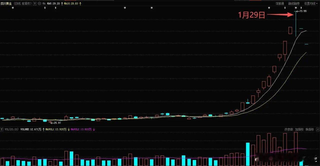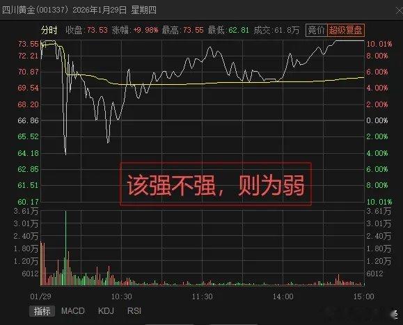 比如2026年1月29日,四川黄金涨停开盘,则为强。但很快开板,而且开板后盘中动荡很大,回封时间很晚,则为弱。