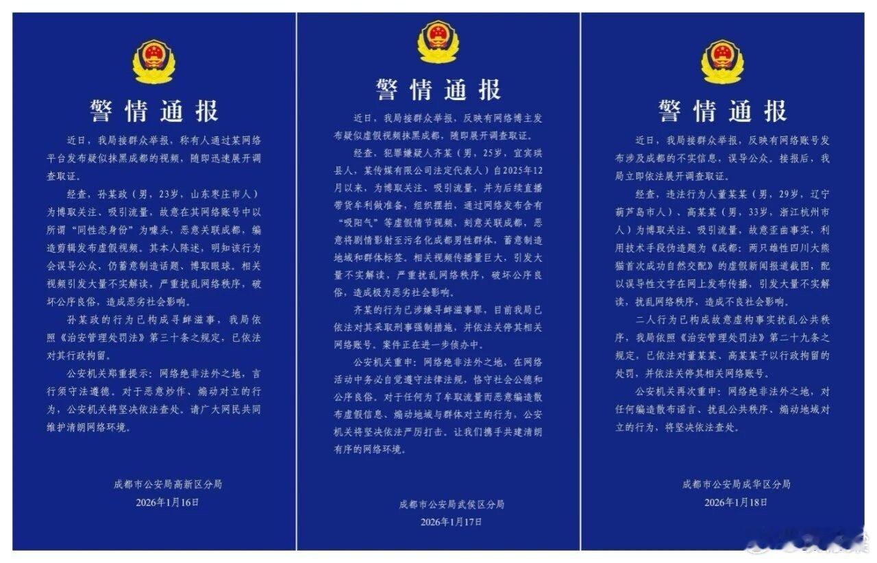 1月16日至18日,成都公安三个分局连发三则警情通报,分别以行政拘留和刑事拘留措施处置了三起涉嫌在网络上抹黑成都,将成都城市形象与同性恋关联的案件。(图3)