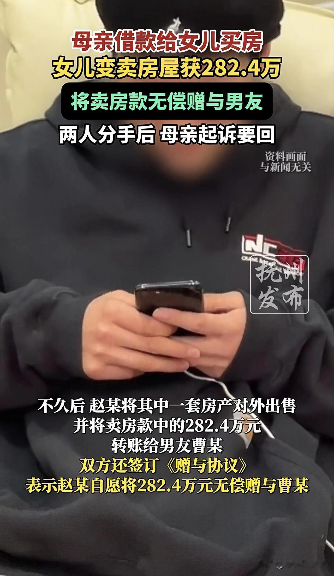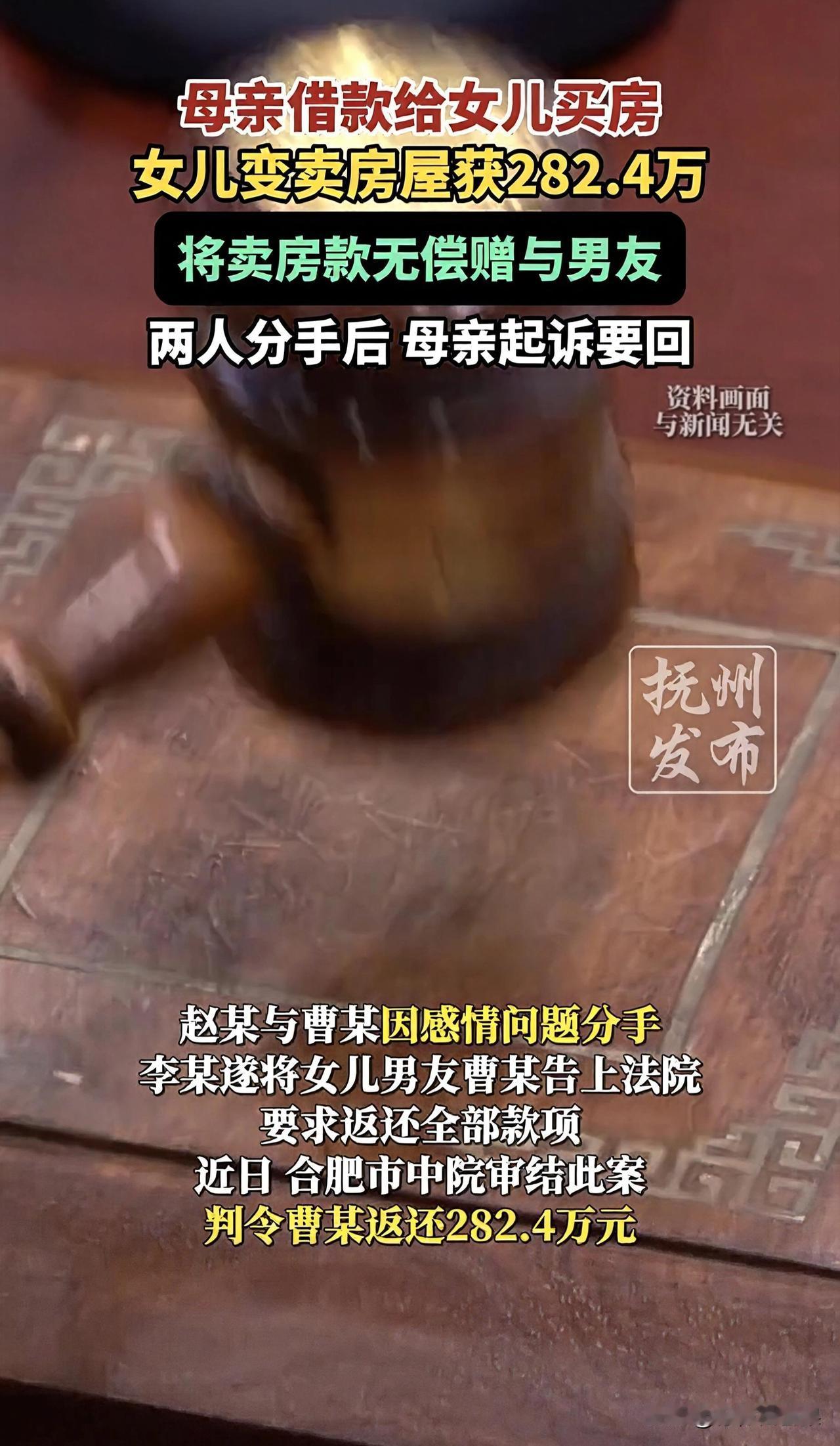 合肥一恋爱脑女儿,拿着妈妈403万的买房血汗钱,转头就把卖房所得的282万全款赠给男友!直到俩人分手,亲妈才知道自己的养老钱被“送”了人,当场怒告前准女婿,结局大快人心! 安徽合肥的李阿姨,一辈子攒下403万血汗钱,给女儿买了两套房,就盼着她往后日子安稳。女儿当时也打了借条,白纸黑字说这钱是借的,谁料转头就犯了恋爱脑! 她直接把一套房卖了,揣着282.4万全款无偿赠给男友,还签了赠与协议,压根没想过这笔钱是要还给妈妈的!合着老妈的养老钱,全成了她讨好男友的资本? 没多久小情侣分手,李阿姨得知这事当场炸了,直接把女儿前男友告上法庭!法院也超给力,判决撤销赠与协议,282.4万一分不少全返还! 这恋爱脑女儿,真的差点就把妈妈的血汗钱白白送给别人,但凡李阿姨当初没留借条这个心眼,这辈子的积蓄怕是都打了水漂! 你们觉得这女儿的做法可气吗?要是你是李阿姨,会原谅女儿吗?评论区聊聊!