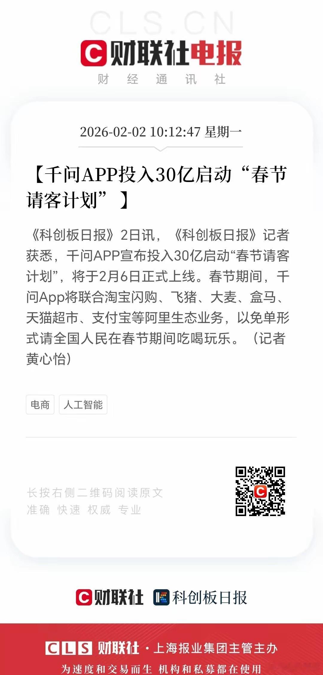 这AI大战一启动,那场面简直太炸裂了!元宝直接拿出10亿元搞春节活动,千问更豪横,30亿请客。这手笔,感觉就像两个武林高手在过招,一出手就是王炸。如今科技飞速发展的时代,AI领域竞争激烈程度可想而知。大长AI竞争全线启动,都想在春节这个流量高峰期抢占更多市场份额。就像打仗一样,先把声势造起来,吸引更多用户的目光。不知道后续还会有啥新动作,这场AI大战,大家搬好小板凳好好围观啦!
