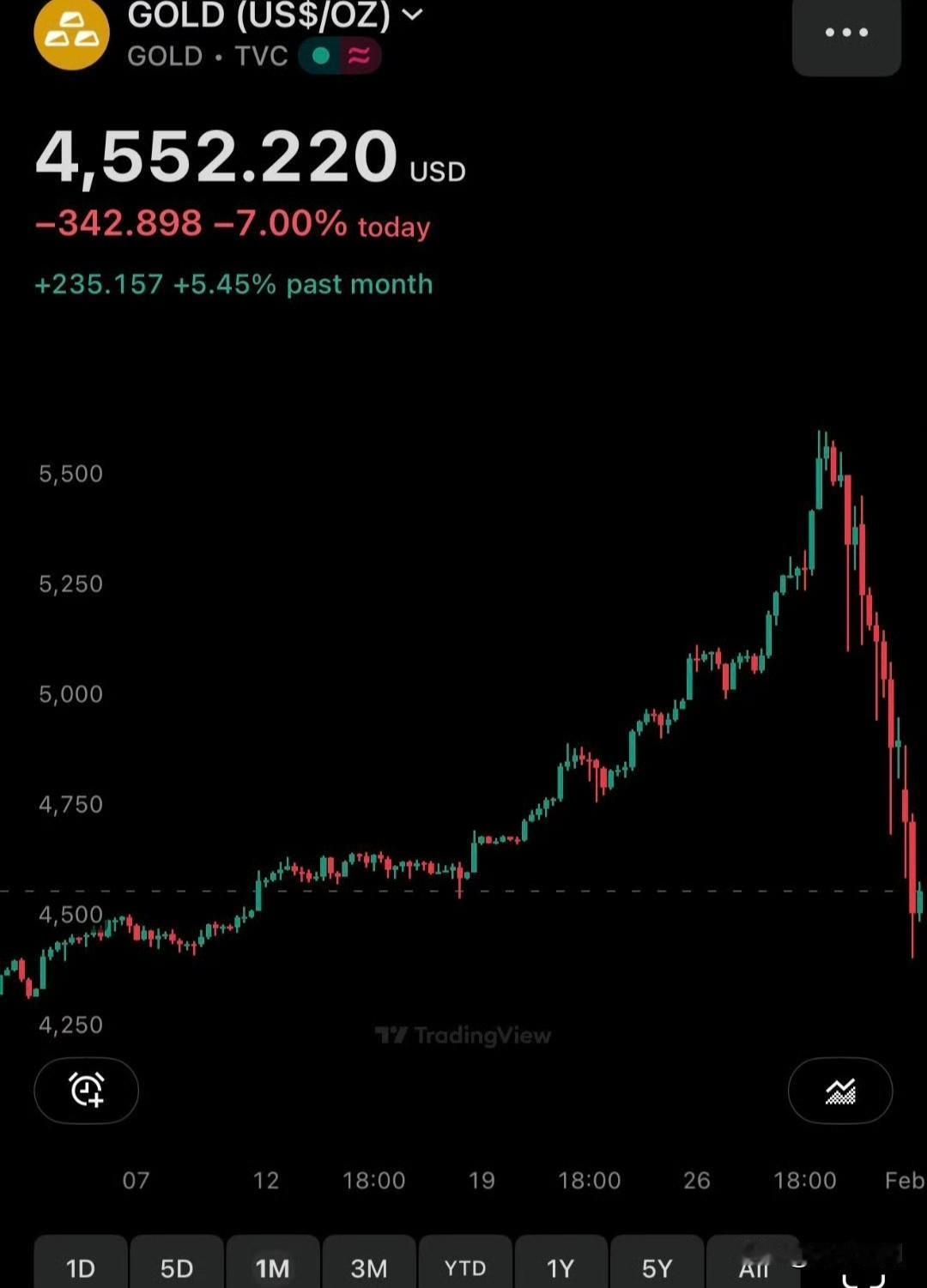 白银和黄金跌至4周低点。 在过去4周内,白银下跌了4.62%,但在过去12个月里上涨了131.92%。 在过去4周内,黄金下跌了0.58%,但在过去12个月里上涨了57.11%。 今日,黄金暴跌7%,跌破4,550美元/盎司;白银大跌12%,跌破73美元/盎司。 交易员估计,今天全球黄金和白银市场市值蒸发约4.02万亿美元。