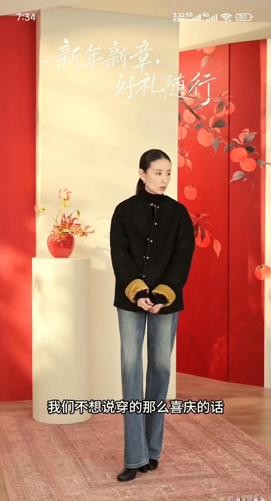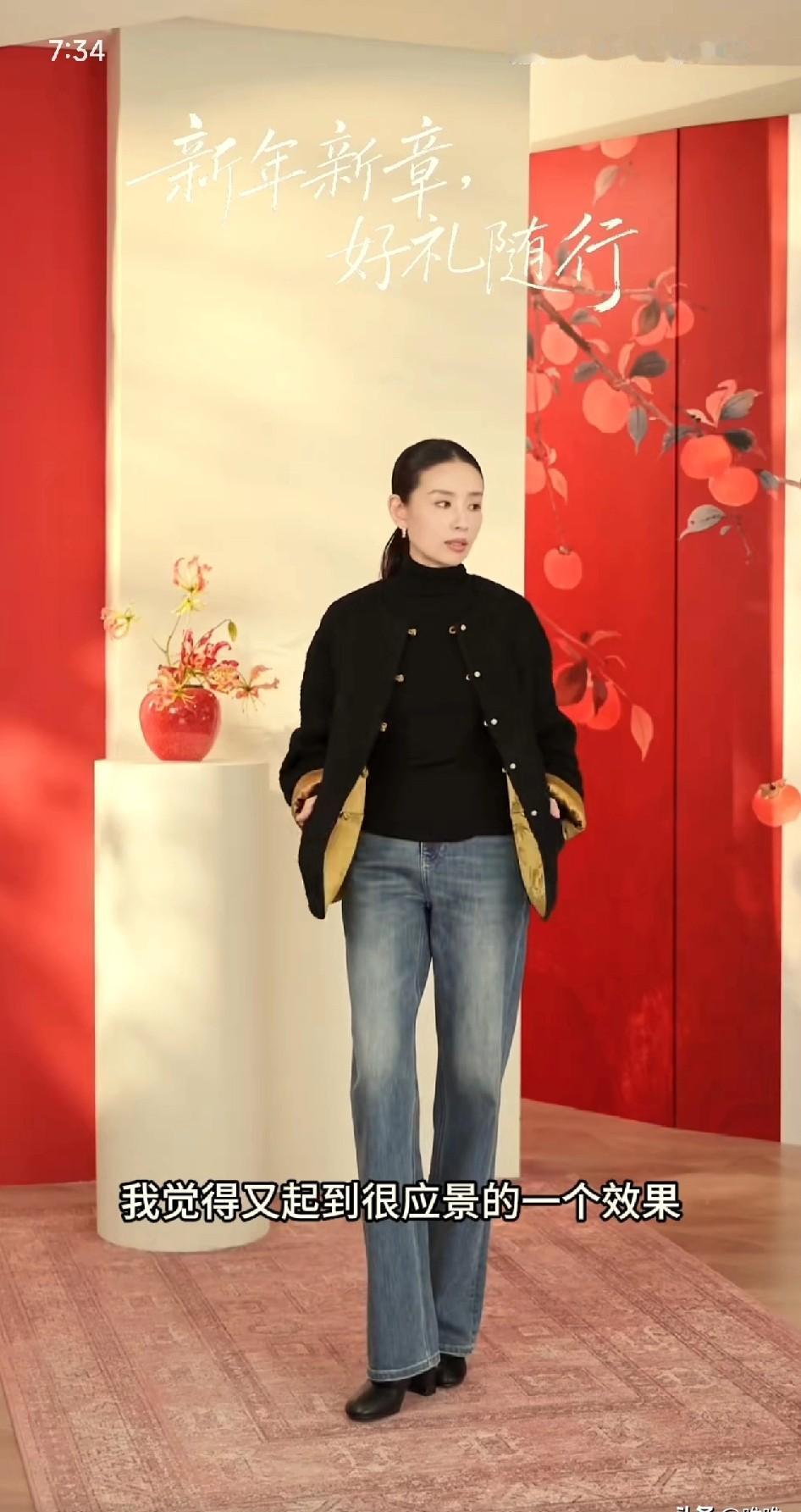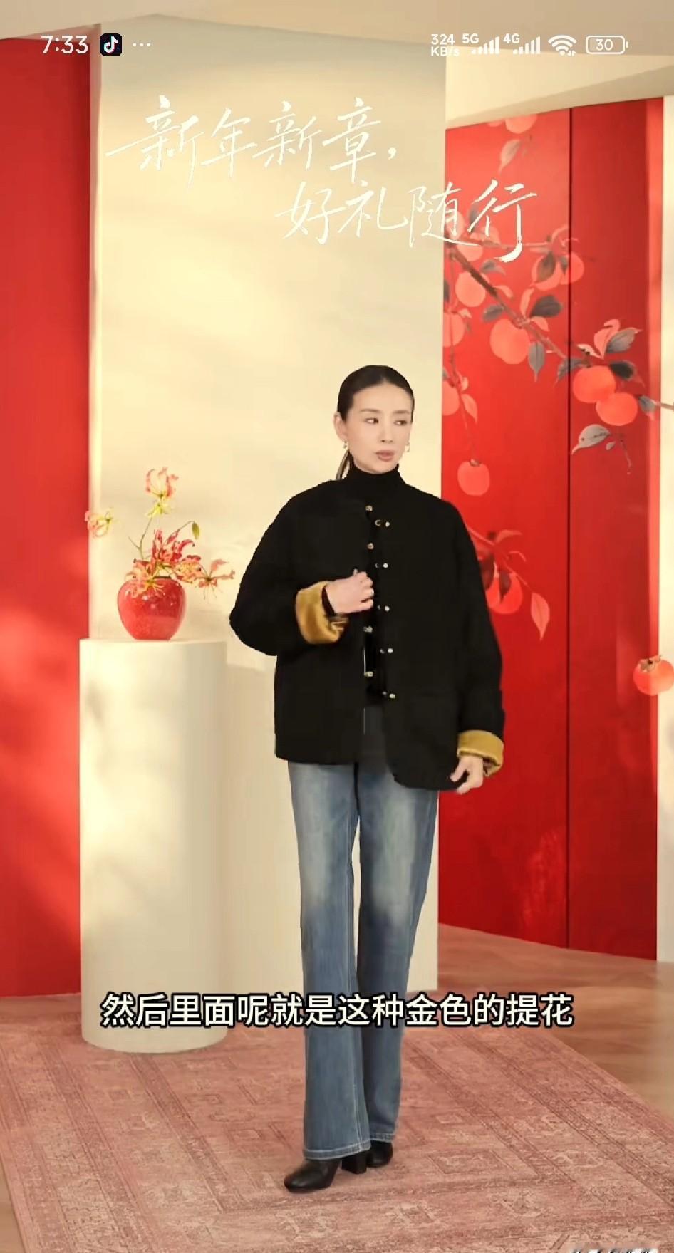 董洁直播间那件外套,我研究了半天,玄机根本不在盘扣,而在袖口。 一面是织锦提花的流光,一面是羊毛的沉静。 你以为是两件衣服,其实它是一件衣服的正反面心机。 她就把黑色羊毛那面穿在外面,轻轻挽起袖口,露出一截金色的内衬。 这一招太高了,把奢华感藏在不经意里,瞬间点亮全身。 底下配一条最简单的直筒牛仔裤,中式的风骨一下就接上了现代的随性。 过完年,这件衣服直接穿去上班、逛街,完全不违和。 真正高级的年味,不是堆砌符号,而是融入骨血。