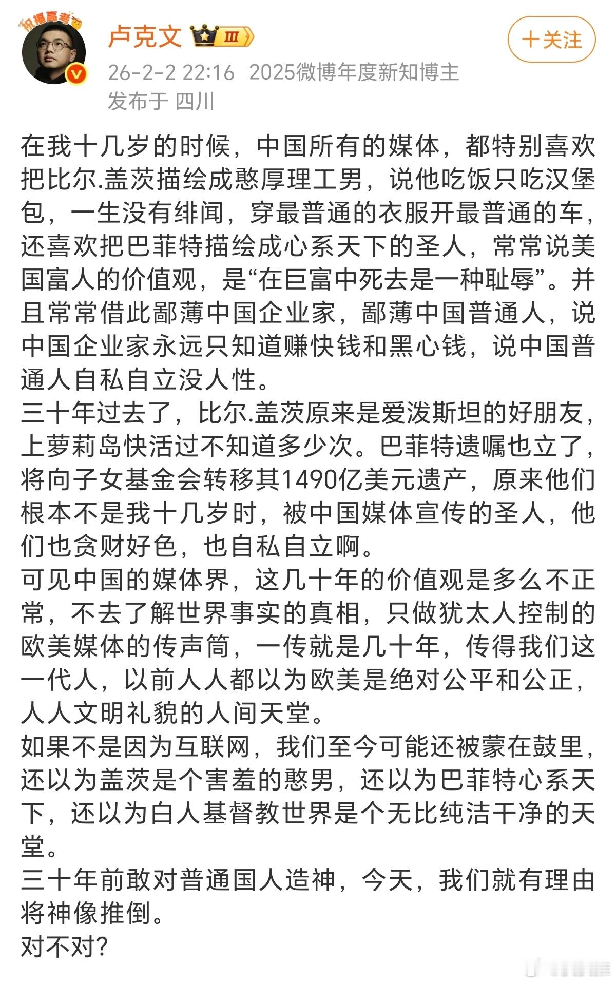 知名大V卢克文在这一舆论浪潮中抛出了颇具争议的观点,他借媒体过往对比尔盖茨的正面报道,直言几十年前的部分媒体沦为“犹太人控制的欧美媒体的传声筒”,将比尔盖茨塑造成完美偶像。