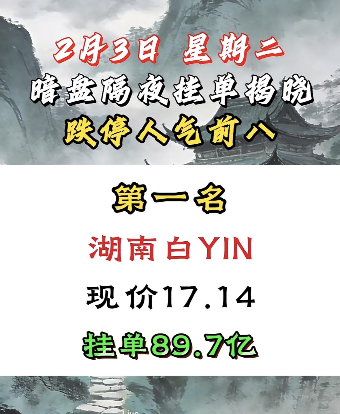 2月3日,中国黄JIN跌停,现价13.21,挂单19.8亿! "湖南某股暗盘跌停领跑,挂单量惊人,市场关注度飙升。"