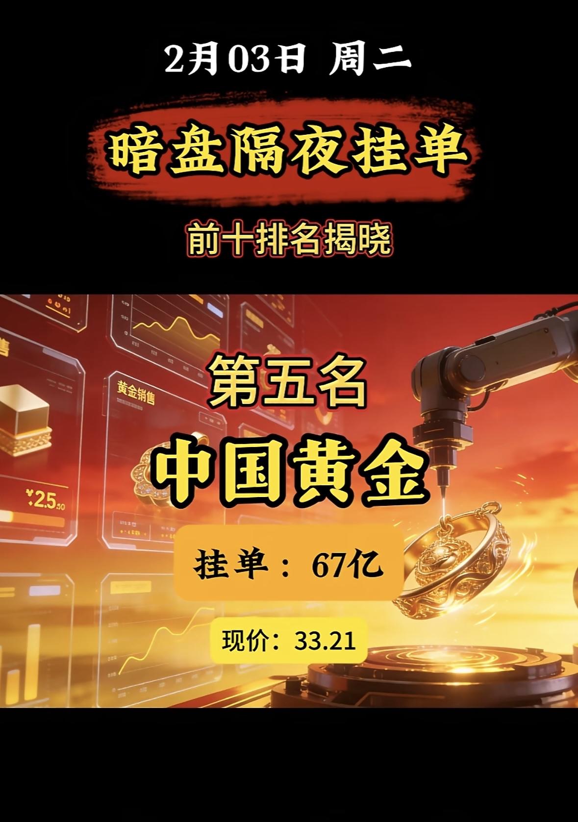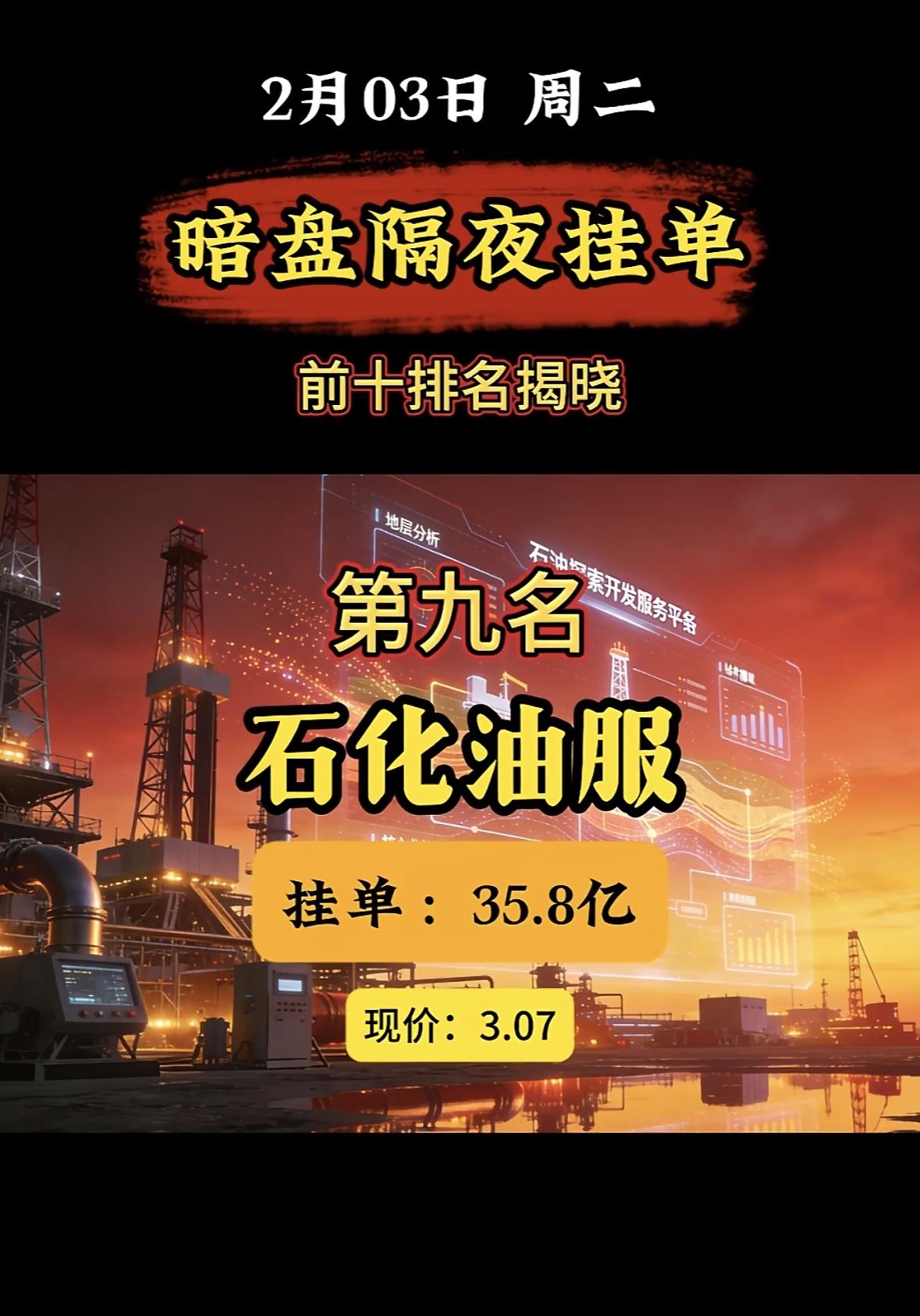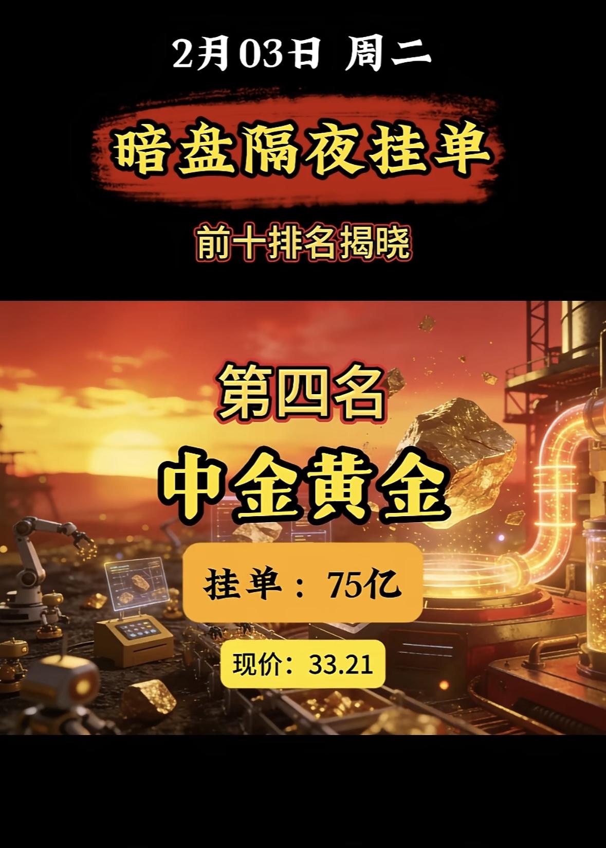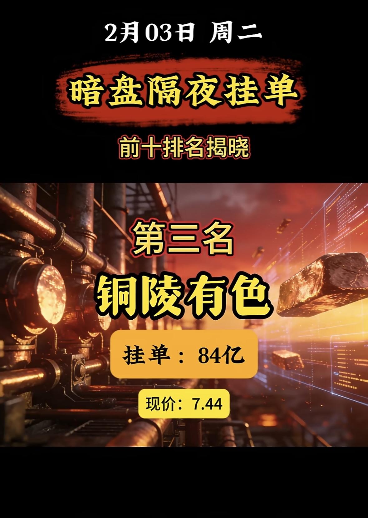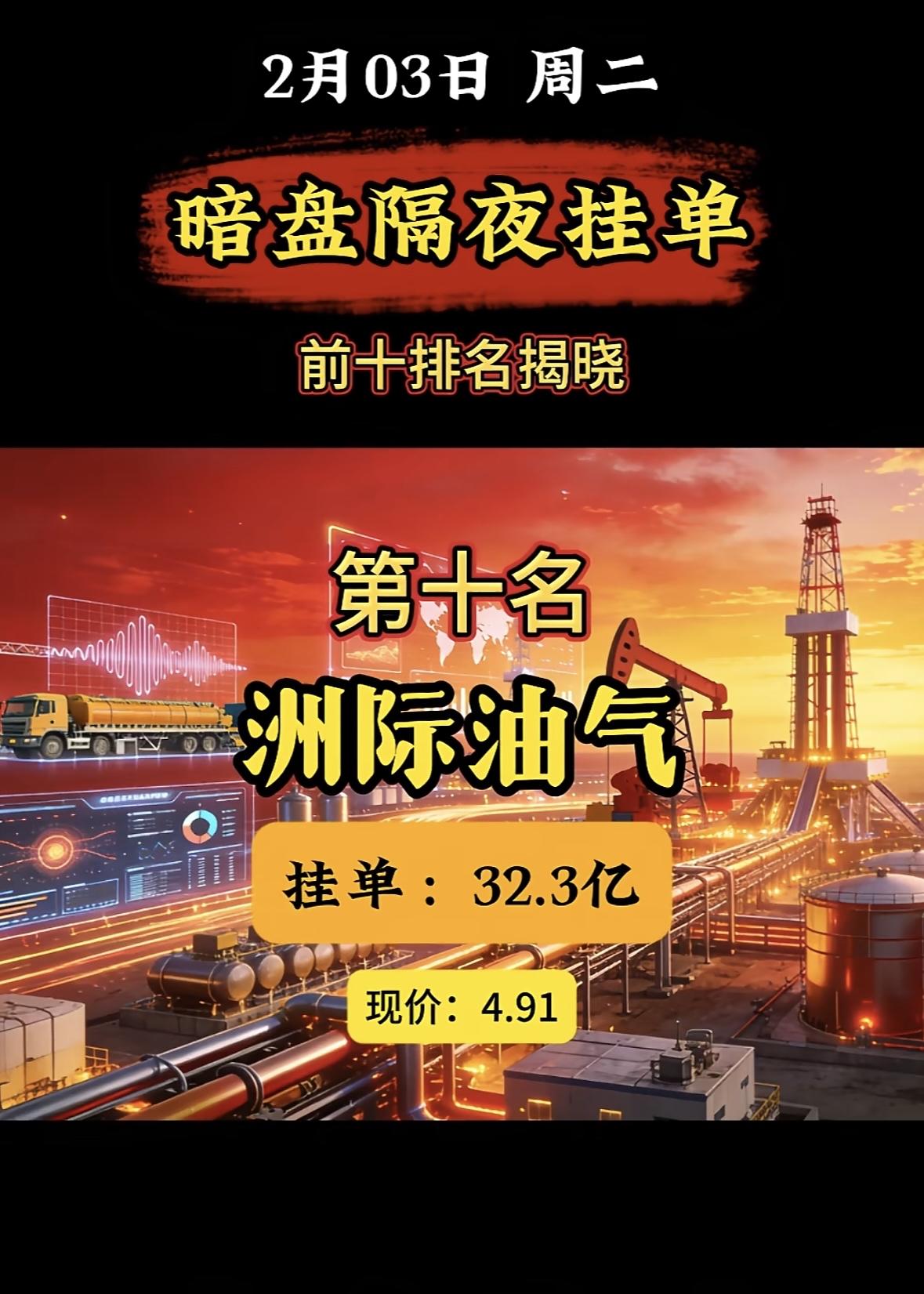 2月3日暗盘隔夜挂单榜揭晓!第十名:洲际油气,挂单32.3亿,现价4.91 2月3日暗盘挂单出炉,白银有色以124亿登顶榜首,现价12.30元。