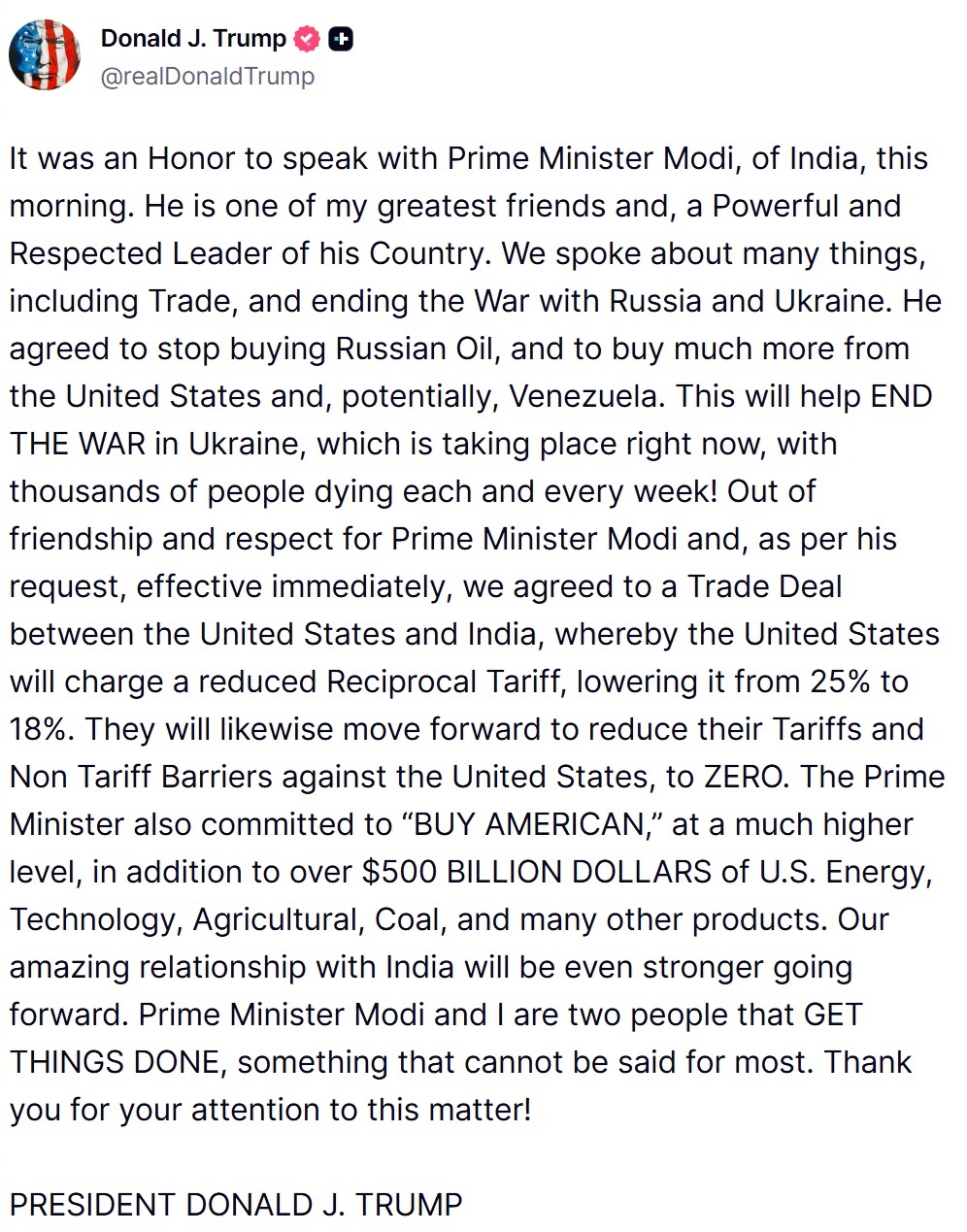 阿川宣布:美国和印度达成贸易协议,莫迪同意停止购买俄油,改从美国和委内瑞拉进口石
