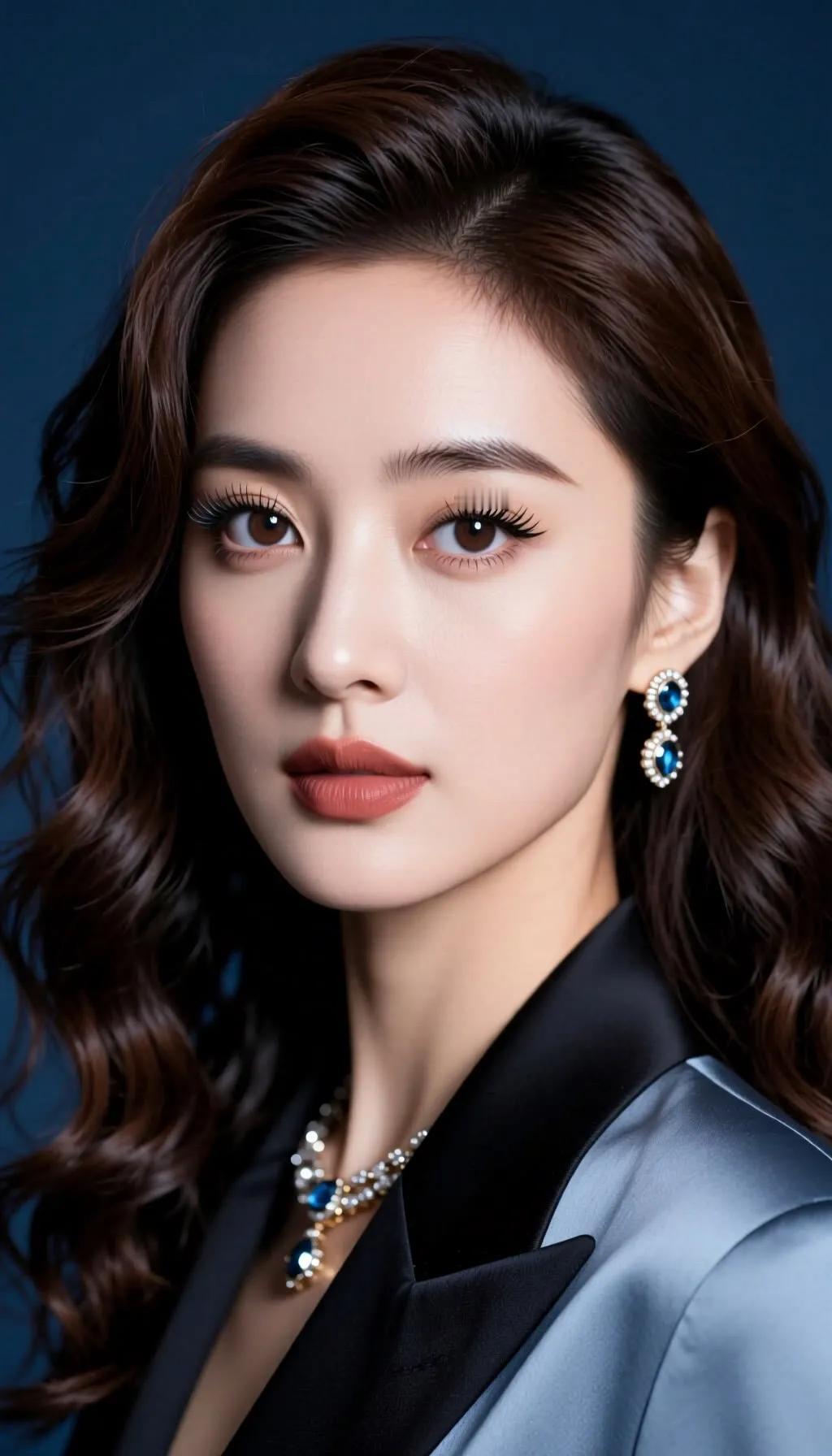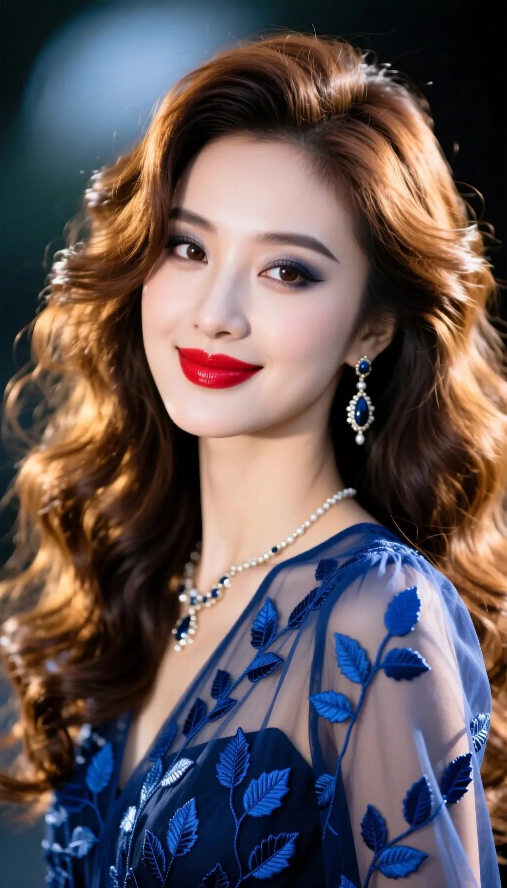 优雅甜美的婚纱写真,梦幻的蓝色背景,精致的蕾丝细节,温柔微笑,宛如童话中的公主。