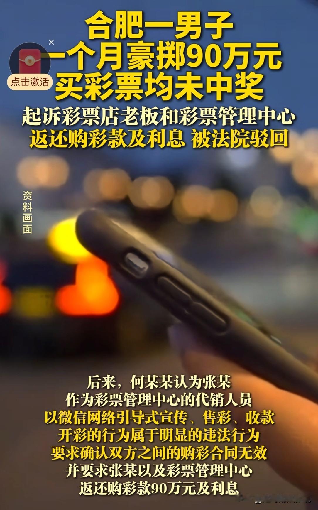 这脑子,应该是被门框挤了!安徽合肥,一男子前后一个月时间,豪掷90万巨款买彩票,结果一次也没有中奖。男子大怒,将彩票店老板告上法庭,要求确认购买合同无效,要求店家、彩票管理中心,返还90万元,法院判决,令人意外! 何某简直气炸了肺,自己想挣个快钱,就想到了买彩票一夜暴富。 和他做梦都没想到,90万元花出去了,一张都没有中奖,这是什么概念? 张某经营着一家彩票店,何某是个老牌彩民。 平时何某常来这家店买彩票,一来二往就和老板混熟了。 后来他不想再跑腿了,就和老板互加了微信。 他通过微信,把想买的彩票号码和类型发给张某,张某就在自己店里把票打出来,拍照传回给他看。 何某某就把钱,直接微信转账到张某的银行卡上。 一来二去,这种不见面的买彩方式就成了习惯。 何某开始只是几十、几百地买,但后来金额越来越大。 张某提醒过他,但何某很犟,他认为,买的越多中奖率越高。 因何某买的数额很大,张某几次通过微信,把大额购彩风险告知书,和大额度预约通知单的二维码发给他。 那告知书上写明,理性投注,量力而行。 何某某每次都扫了码,也填了单子,但并没停手,反而手笔越来越大。 将近一个月的时间,他前前后后转给张某的钱,加起来有90元。 90万元,换来一堆数字各异的彩票照片,存在手机里。 开奖的结果,让何某某暴跳如雷,又沮丧绝望。 他那90万元,像扔进水里,连个响泡都没打。 巨大的失落,和随之而来的不甘心,很快转化成了愤怒。 他琢磨着,这事不能这么算了,这笔钱都可以买一套楼房了,不能就这么打了水漂,得有人负责! 于是他把张某、以及体育彩票管理中心,一起告上法庭。 可是,他出钱买彩票,老板收钱后出票发送给他,各个环节做的滴水不漏。 想告,也得有个合适的理由,不然根本就不成立。 何某考虑后,他提出的理由挺有意思。 他认为,张某作为体彩中心的代销员,经常通过微信方式,进行引导式宣传、销售、收款、开奖,这么就是违法。 他就是看了朋友圈,张某的开奖宣传,才动心的。 所以,他和张某之间的购买彩票合同,应该无效。 对方应该把他的90万元购彩款,连同利息,全部还给他。 在他的逻辑里,这90万成了他的损失,而这损失是由于对方的“违法”销售造成的。 法庭上,双方举证质证,把那些微信聊天记录、转账凭证、风险告知书的填写记录,都摆上了台面。 法院经审理认为,张某和体彩中心之间,是代销关系。 张某是个体经营者,他从体彩中心获得授权,在他的实体店铺里销售彩票。 他们签的合同白纸黑字写着,代销者要自己处理和彩民之间的纠纷,并承担相应的责任。 体彩中心,对张某进行了必要的培训,该尽的管理责任算是尽到了。 所以,何某想把体彩中心拉进来一起赔钱,依据不足。 其次,何某指控张某在朋友圈,和微信群发中奖的彩票单号,是“引导”和“诱导”。 法院认为,张某展示其他彩民中奖的事实,这只是一种信息传播。 看到这些信息的人,会不会去买、买多少,这取决于个人自己的判断和决定。 它并不必然导致看见的人就去大额投注。 何某拿出的证据,并不能证明,在他每一次掏出大笔钱买彩票之前,张某对他个人进行了什么特别的、带有怂恿性质的引导。 换句话说,发中奖喜讯,是行业常见现象,但这和何某自己做出的购买决策,没任何关联。 何某是一个具有完全民事行为能力的成年人。 一个正常的成年人,应该明白一个最基本、最简单的道理。 买彩票,是一种机会、游戏,中奖是偶然的,不中奖才是常态。 没有任何人、任何机构,能保证你购买就一定中奖。 这个常识,他应当是知晓的。 更重要的是,在他大额投注的过程中,张某并非没有作为。 那些风险告知书、预约通知单,一次次发给他,让他扫码确认,这就是在履行提醒义务。 张某甚至在微信里,口头劝过他理性购买。 是何某某自己置之不理,选择继续投入巨资。 那么,在开奖结果不如意之后,怎么能把自己自愿承担的商业风险,单方面定义为损失,并要求别人来赔偿呢? 这于情于理于法,都说不通! 何某是通过微信发送,投注指令并支付钱款。 张某是在其获得授权的实体销售点内,使用正规的彩票销售终端机出票。 并将收到的购彩款,如实缴入了体彩中心的官方账户。 这个过程,是何某远程委托张某代为操作实体店内的彩票机。 它和那种纯粹依靠互联网平台接单、资金划转的网络销售彩票是两码事。 目前禁止的是未经批准的,互联网彩票销售。 因此,双方形成的合同关系,是有效的。 最终,法院驳回了何某的全部诉讼请求。 此事曝光后,评论区里炸了锅:有这90万干点啥不行?何某的脑袋是被门框挤了? 咱就凭他这智商,这90万他是怎么得来? 还有人说,如果中了一等奖,你还说无效,不去领奖吗? 对此你怎么看? 关注@赵哥的法律观