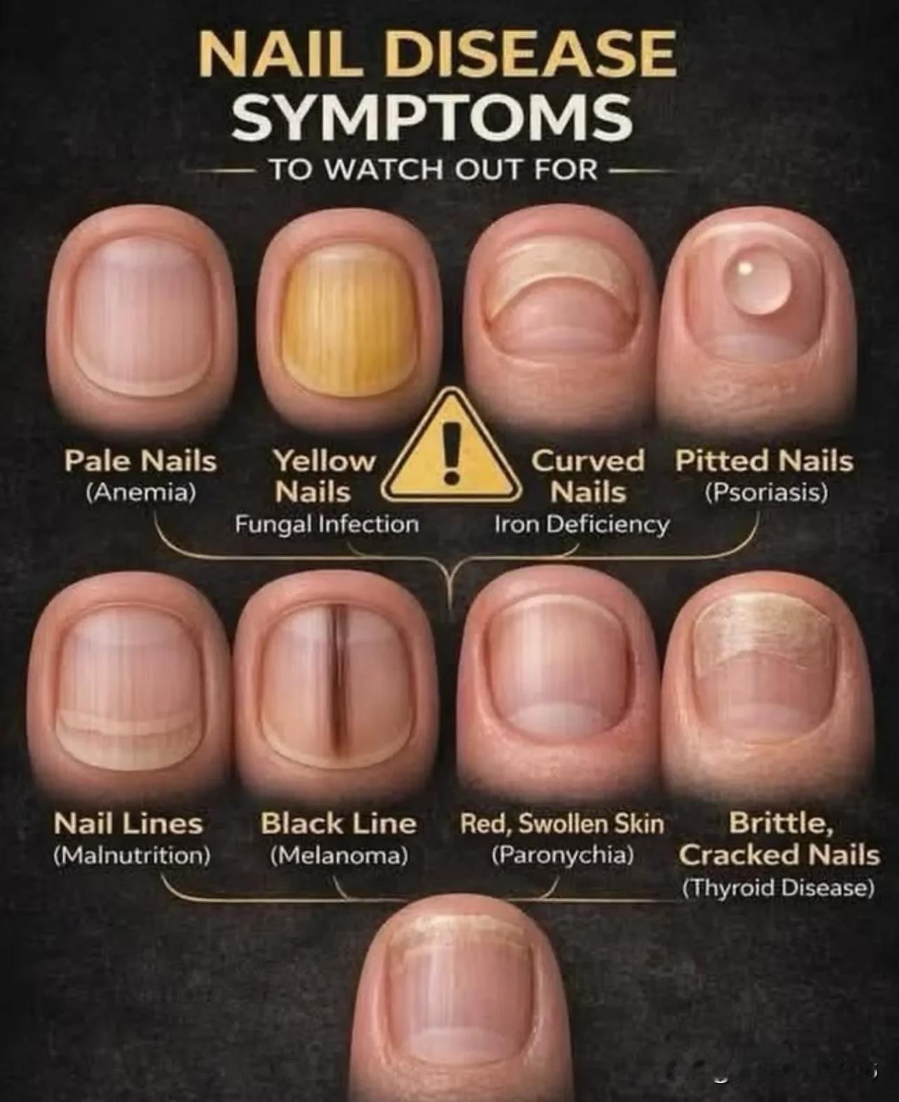 指甲诊断:需要注意的指甲疾病症状 指甲苍白 (贫血) 指甲发黄 真菌感染 ! 指甲弯曲 缺铁 指甲凹陷 (银屑病) 指甲纹 (营养不良) 黑线 (黑色素瘤) 皮肤红肿(甲沟炎) 指甲脆弱易裂 (甲状腺疾病)