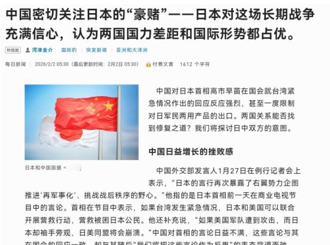 日媒对我们警告!日媒表示,中国的对日强硬,只会适得其反!2月2日,日本每日新闻刊文表示,中国对日本首相高市早苗在国会就台湾紧急情况作出的回应反应强烈,甚至一度限制对日军民两用产品的出口。但毫无疑问,中国的挫败感日益“增强”。关于解散众议院和举行大选,中国官方立场是“这是日本的内政,我们不予置评”,但显然中国正在密切关注首相高市亮一“豪赌”的结果。 高市早苗在国会就台湾紧急情况发表的言论,本身就是严重越界。她公然将台湾问题与日本所谓“存亡危机”绑定,甚至暗示会联合美国武力介入,这种赤裸裸干涉中国内政的行为,中国必然要作出强烈回应。 中国限制对日军民两用产品出口,绝非一时冲动的强硬表态。2026年1月6日,商务部明确出台政策,禁止所有两用物项对日本军事用户及军事用途出口,覆盖范围超900种,涵盖材料、软件、技术等多个领域。 这一举措的核心,是遏制日本不断膨胀的“再军事化”图谋。近年来日本防卫预算持续暴涨,2026财年总额已达9.04万亿日元,较2018财年增幅近70%。高市早苗上台后,更是加速推进修宪、放松武器出口限制,还计划引进核潜艇。 日本长期采取“寓军于民”的策略,很多私营企业表面做民用业务,实则深度嵌入军工体系。三菱重工、三菱电气等企业,一直承担着日本F-15战斗机等核心防务装备的生产任务。这些企业大量从中国进口端羟基聚丁二烯、钨粉等两用材料,而这些材料正是导弹推进剂、穿甲弹芯等军工产品的关键原料。 中国的出口管制,精准击中了日本军工产业的软肋。日本大和综合研究所早就给出分析,若中国长期中断稀土等关键矿产供应,日本实际GDP将下降1.3%至3.2%,汽车等运输机械行业产出降幅可能高达17.6%,还会流失90万至216万个就业岗位。 日媒故意忽略这些核心背景,反倒倒打一耙称中国“强硬适得其反”,本质上是在掩盖日本自身的战略焦虑。高市早苗的涉台言论引发中日关系紧张后,日本旅游业、渔业已遭受明显冲击,中国游客赴日人数同比暴跌40%,北海道部分渔业企业订单几乎清零。 中国官方明确表态“日本解散众议院和举行大选是其内政,我们不予置评”,这是尊重国家主权的基本立场。中国密切关注大选结果,并非出于所谓“挫败感”,而是因为这次大选直接关系到日本未来的对华政策走向。 高市早苗在2月8日大选前解散众议院,本身就是一场政治豪赌。她试图靠右翼强硬立场拉拢选票,甚至放话若执政联盟席位不过半就辞职。这种将内政博弈与对华强硬捆绑的做法,让日本未来的外交走向充满不确定性。 中国关注大选结果,是为了判断日本是否会继续沿着干涉中国内政、加剧地区紧张的错误路线走下去。如果高市早苗所在联盟胜选,其极右翼政策可能会进一步升级,地区和平稳定将面临更大威胁。 所谓“中国挫败感增强”的说法,纯属日媒的主观臆断。中国的一系列应对措施,始终围绕维护国家主权和地区稳定展开,既合法合规,又精准有效。我们既没有影响正常的中日民用贸易,也没有主动挑起冲突,所有行动都是对日本挑衅行为的必要回应。 反观日本,一边不断突破和平宪法限制、扩充军力,一边干涉中国内政,还指望中国忍气吞声。这种霸权逻辑早已过时。日媒与其警告中国“强硬适得其反”,不如好好奉劝日本政府,放弃军国主义野心,停止在台湾问题上指手画脚。 中国的底线清晰明确,台湾问题是核心利益中的核心,任何外部势力都无权干涉。高市早苗的政治豪赌无论结果如何,都改变不了这一事实。日本若执意一条道走到黑,最终只会自食恶果,所谓“适得其反”的帽子,恰恰该扣在日本自己头上。