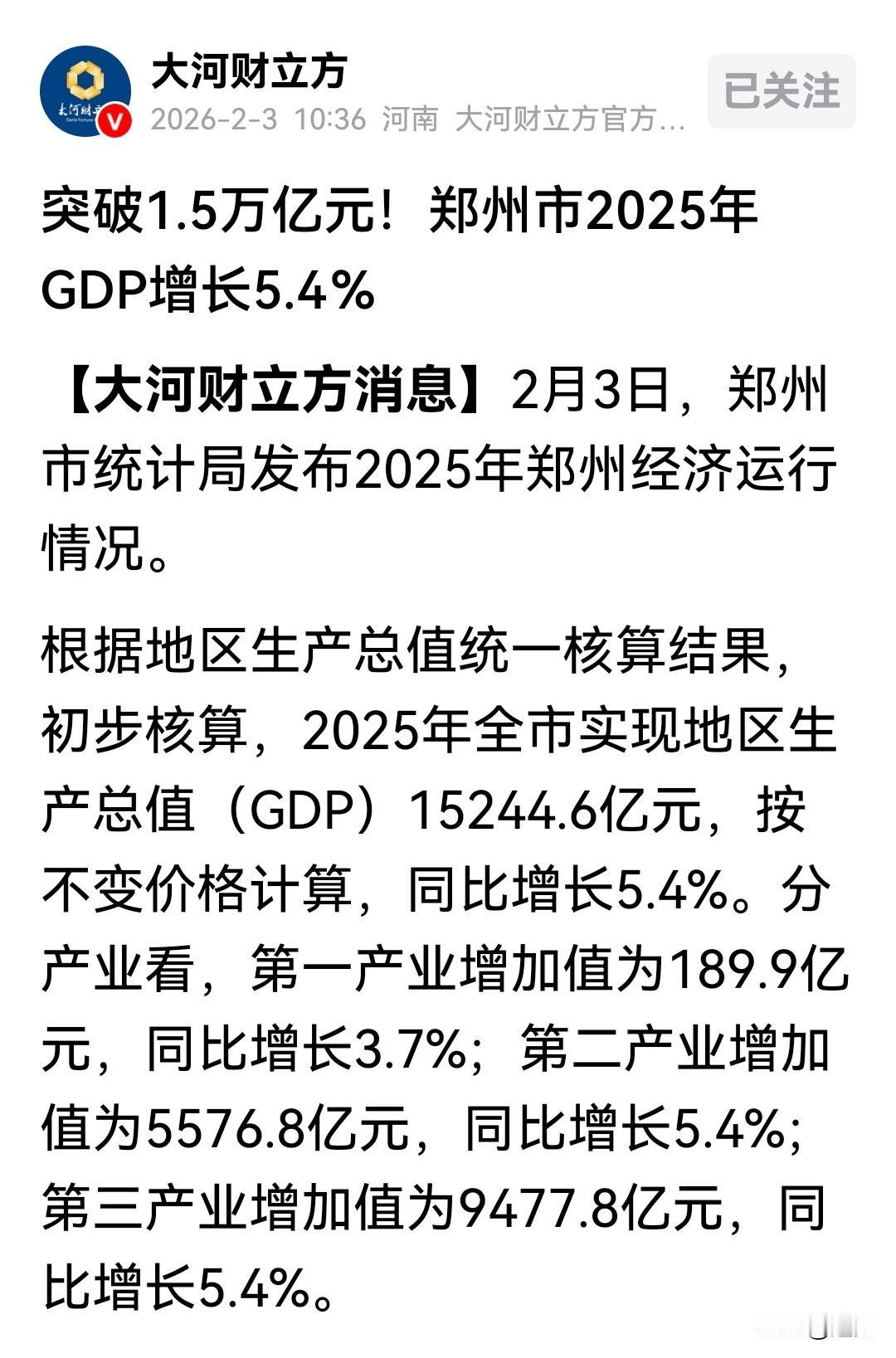 郑州2025年GDP数据公布,突破1.5万亿!达到了15244.6亿元!同比增长5.4%! 对于这个结果,没有惊喜,因为省内其它城市都已经出了数据,郑州的大概结果就这么多! 跨越1.5万亿,值得庆祝,增量突破700亿,实现了增速回归,也为2026年迈上1.6万亿奠定了良好基础! 高兴的同时,我们也应该感到压力,看数据,郑州的经济总量仅仅比福州高出132.28亿元!要知道福州今年的增速大于郑州很多,郑州明年有被超越的风险! 亮眼的成绩单,说明郑州终于走出了调整期和阵痛期,期待2026年郑州能够展现真正的实力和风采! 国际郑的风貌和中原崛起的担当决定了郑州没有退路,必须勇往直前! 加油,郑州!