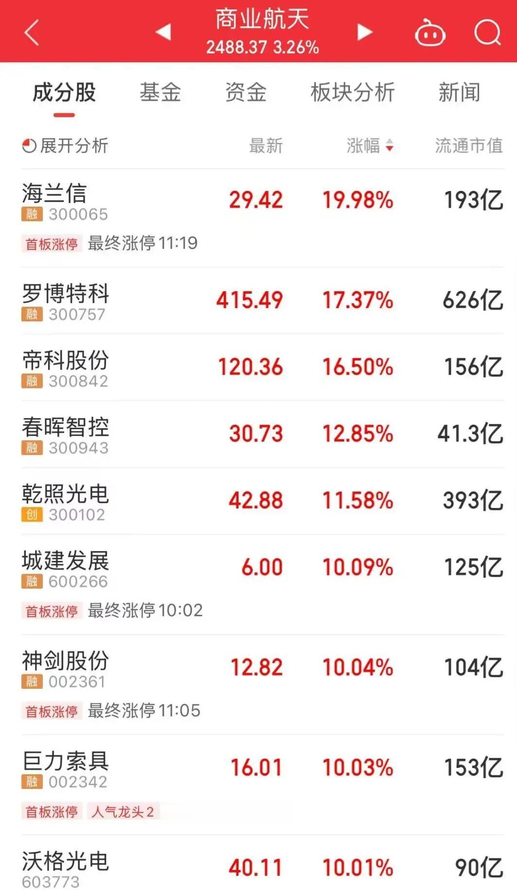今天上午,商业航天板块上涨,海兰信、帝科股份等个股大涨。