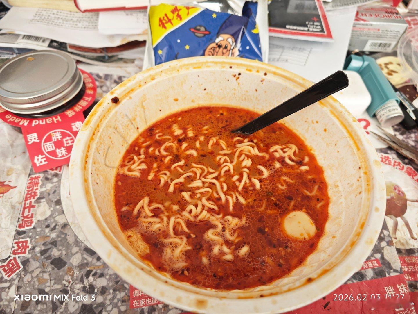 昨天剩下的面汤,加入开水,加入宝岛方便面,又加入胖妹面庄灵魂佐料,变得好吃了,最后连汤都喝完了。完美的午餐。