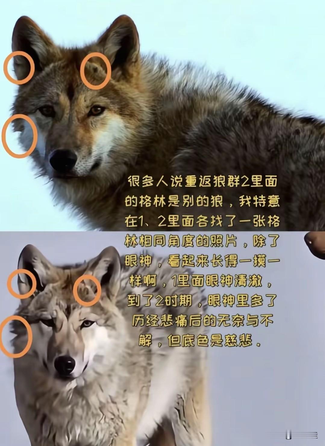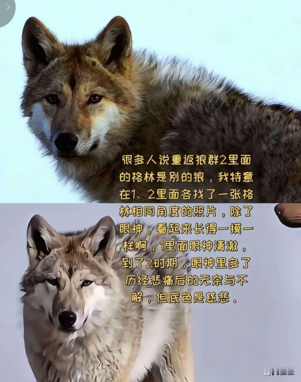 原来格林的眼神,藏着这么多故事!把《重返狼群》两部里的格林放在一起对比,才发现它的变化全写在眼睛里了。 第一部里的格林,眼神清澈得像草原的湖水,带着点懵懂和好奇,是被人类妈妈疼爱的小狼崽。到了第二部,它的眼神里多了历经伤痛后的无奈与不解,却依然藏着一丝慈悲。 有人质疑第二部里的格林是别的狼,可当相同角度的照片放在一起,除了眼神,长相几乎一模一样。这哪是换了狼,分明是草原的风、生存的苦,都刻进了它的眼睛里。 从依赖人类的幼崽,到在狼群里摸爬滚打的成年狼,格林的眼神变化,就是它的成长史。原来真正的成长,不是变得冷漠,而是经历过伤痛后,依然保留着心底的温柔。