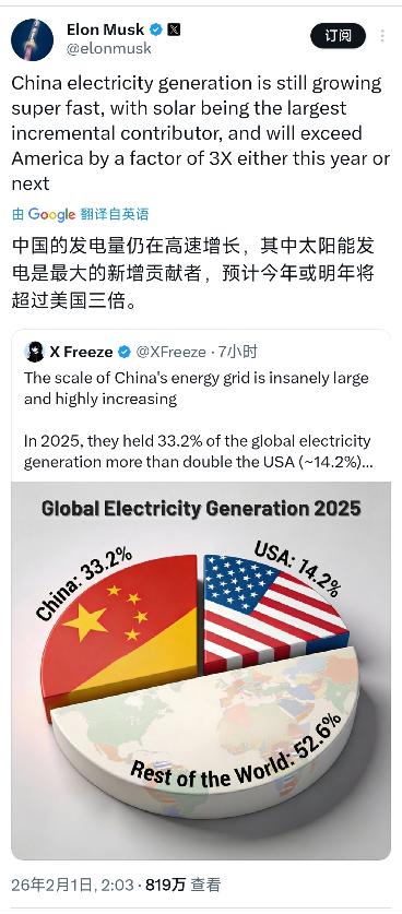 埃隆·马斯克今天(北京时间2月1日)写道:“中国的发电量仍在高速增长,其中太阳能发电是最大的新增贡献者,预计今年或明年将超过美国三倍。”   真不是马斯克随便说,而是中国太阳能发电确实在创造奇迹。全球能源转型的赛道上,中国正以肉眼可见的速度甩开对手。这背后是技术、政策、产业链三重优势的叠加,更是中国能源战略前瞻性的体现。   中国太阳能的爆发式增长,根本原因在于技术突破和产业协同。特高压输电技术的成熟,让西部戈壁的阳光能在0.01秒内直达东部负荷中心。   这项全球唯一大规模商用的输电技术,不仅解决了能源分布不均的难题,更将输电损耗控制在每千公里2%以内。当美国还在为跨州输电审批扯皮时,中国已建成42条特高压线路,年输送电量超3400亿千瓦时,相当于3个三峡电站的年发电量。   产业链的绝对优势让中国光伏成本一骑绝尘。从多晶硅到组件,中国占据全球90%以上产能,这种规模效应直接将组件价格压到美国的58%。   更关键的是,中国掌握着光伏产业的核心专利,隆基绿能的硅基叠层电池效率突破33.4%,南京大学的全钙钛矿电池达到30.1%,这些实验室成果正加速转化为生产力。当美国企业还在为进口中国光伏组件缴纳高额关税时,中国早已形成“技术研发-规模化生产-全球应用”的闭环。   政策支持的连贯性是中国太阳能崛起的关键。“十四五”规划明确非化石能源消费比重目标,《关于大力实施可再生能源替代行动的指导意见》更是将太阳能列为核心增量。   这种顶层设计带来的是持续的投资和稳定的市场预期。2025年中国新增太阳能装机315GW,占全球总量的56%,相当于每天新增近900个足球场大小的光伏电站。反观美国,联邦层面缺乏统一能源战略,各州政策差异大,2025年新增装机仅68GW,且三成都因供应链问题停滞。   电网消纳能力的提升让中国太阳能真正“发得出、用得上”。新型储能装机突破1亿千瓦,占全球40%以上,配合智能电网调度,2025年风光利用率达94.8%。西北地区的光伏电站旁,往往配套建设储能站和数据中心,形成“发电-储能-消纳”的绿色闭环。   这种模式不仅解决了弃光问题,更将太阳能转化为数字经济的动力源。而美国电网因70%设备超期服役,2025年数据中心电力缺口达44GW,AI企业为电费发愁的同时,还要面对频繁停电的风险。   中国太阳能的发展还带来显著的经济和环境效益。2025年非化石能源占能源消费比重超石油,成为第二大能源类型,年减排二氧化碳超40亿吨。   光伏产业带动就业超500万人,从硅料生产到电站运维,形成完整的产业链生态。当美国还在为天然气价格波动焦头烂额时,中国已通过太阳能实现能源自给率提升,降低对进口化石能源的依赖。   当然,中国太阳能的发展也面临挑战。西部土地荒漠化风险、储能技术成本高企、国际市场贸易壁垒等问题仍需解决。   但正如特高压技术突破初期面临的质疑一样,中国正以“集中力量办大事”的体制优势逐个击破。随着钙钛矿叠层电池、漂浮式光伏等新技术的应用,太阳能将在更多领域替代传统能源。   马斯克的判断,本质上是对中国能源转型战略的认可。当美国还在纠结于短期利益和政治博弈时,中国已通过技术创新、产业升级和政策引导,在太阳能领域建立起难以撼动的优势。   这种优势不仅体现在装机容量和发电量上,更体现在从基础研究到工程应用的全链条竞争力。未来的能源格局,或将因中国太阳能的崛起而彻底改变。